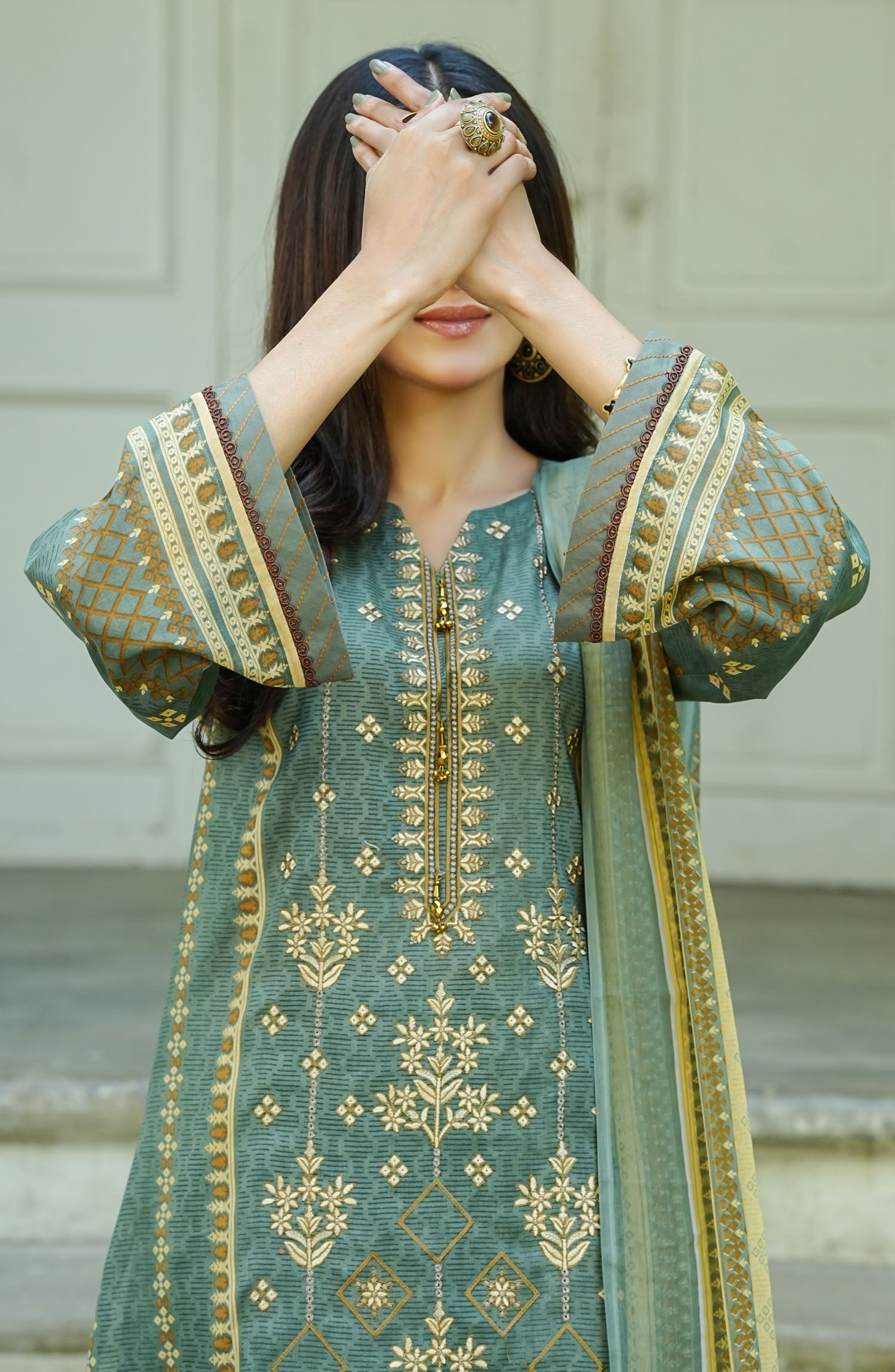 The standard style comes as a long-sleeved kameez with dupatta and trouser/shawlar.