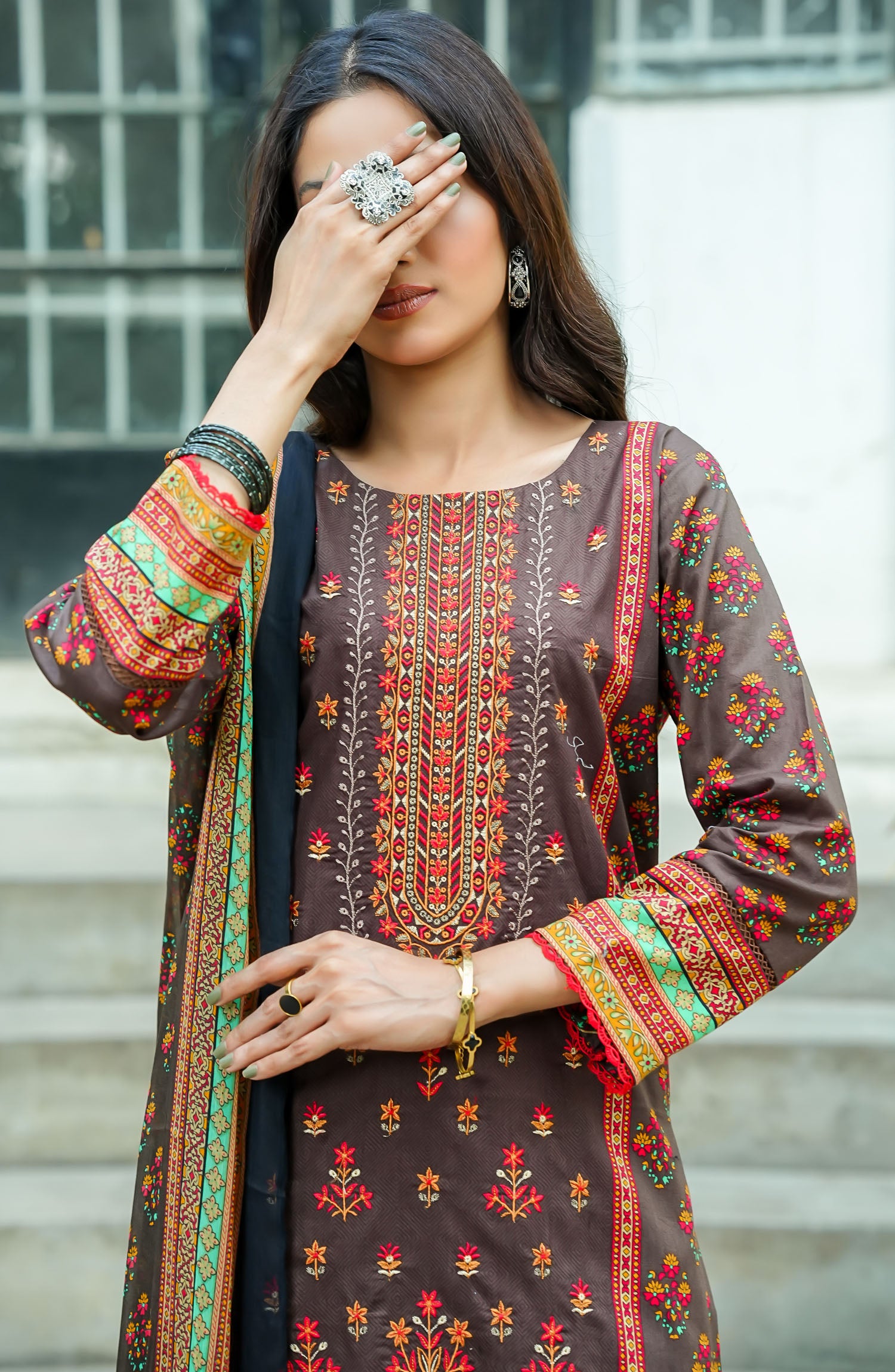 Rua by Casual Lite Embroidered Premium Linen Stitched 3 Piece Suit - D-03 Shadow Bloom - CL25RU - Black - Winter Collection