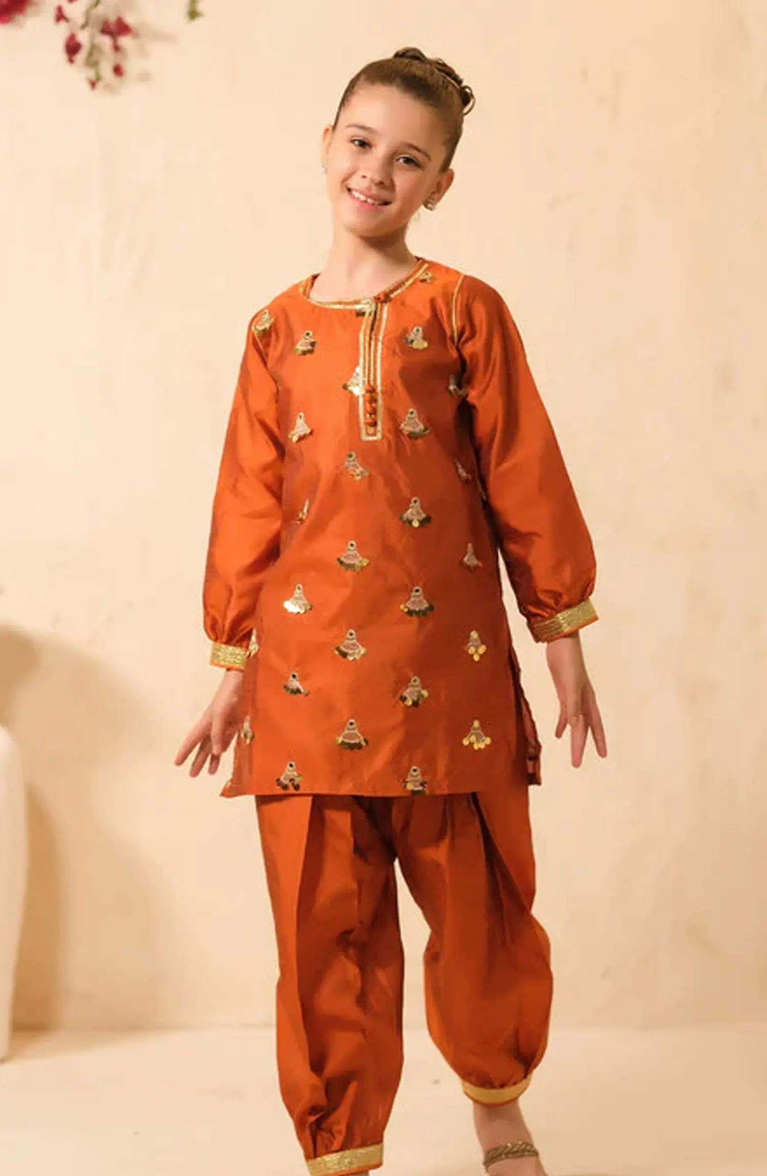 Introducing our stunning Kohsaar Balloon Shalwar with Kamiz for girls, inspired by the grandeur of the mountains. The rich rust color evokes warmth and elegance, beautifully complemented by golden embroidery and delicate lace accents. The balloon shalwar adds a playful touch, while the gathered sleeves create a charming silhouette. Crafted with meticulous attention to detail, this outfit is designed to make your little one feel like a princess. Let her shine with grace and style in this enchanting ensemble. Material: Raw Silk