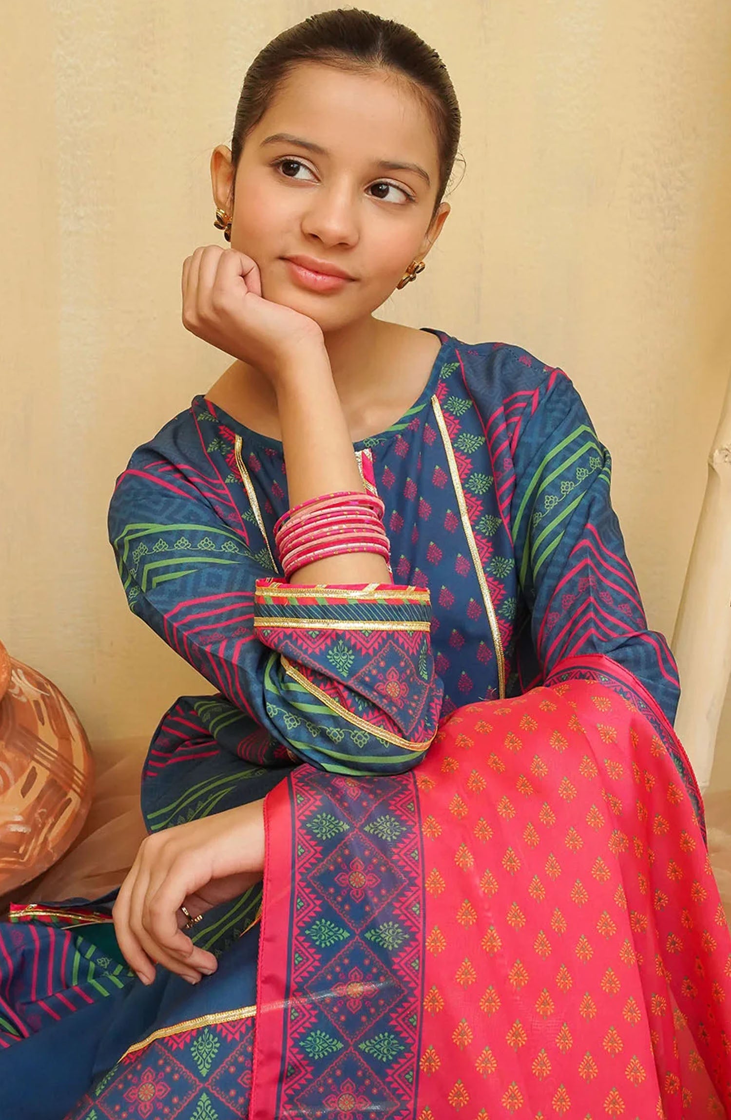 Top: Teal Blue Swiss Lawn Digital Printed Kurta with Gota Laces