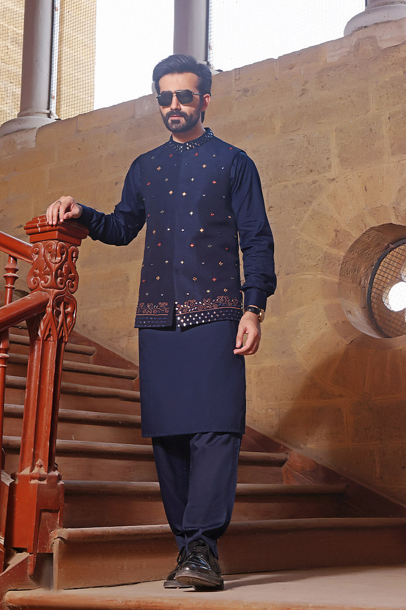 Men's Formal Raw Silk Hand Embroidered Waistcoat with Matching Blended Kurta Pyjama.