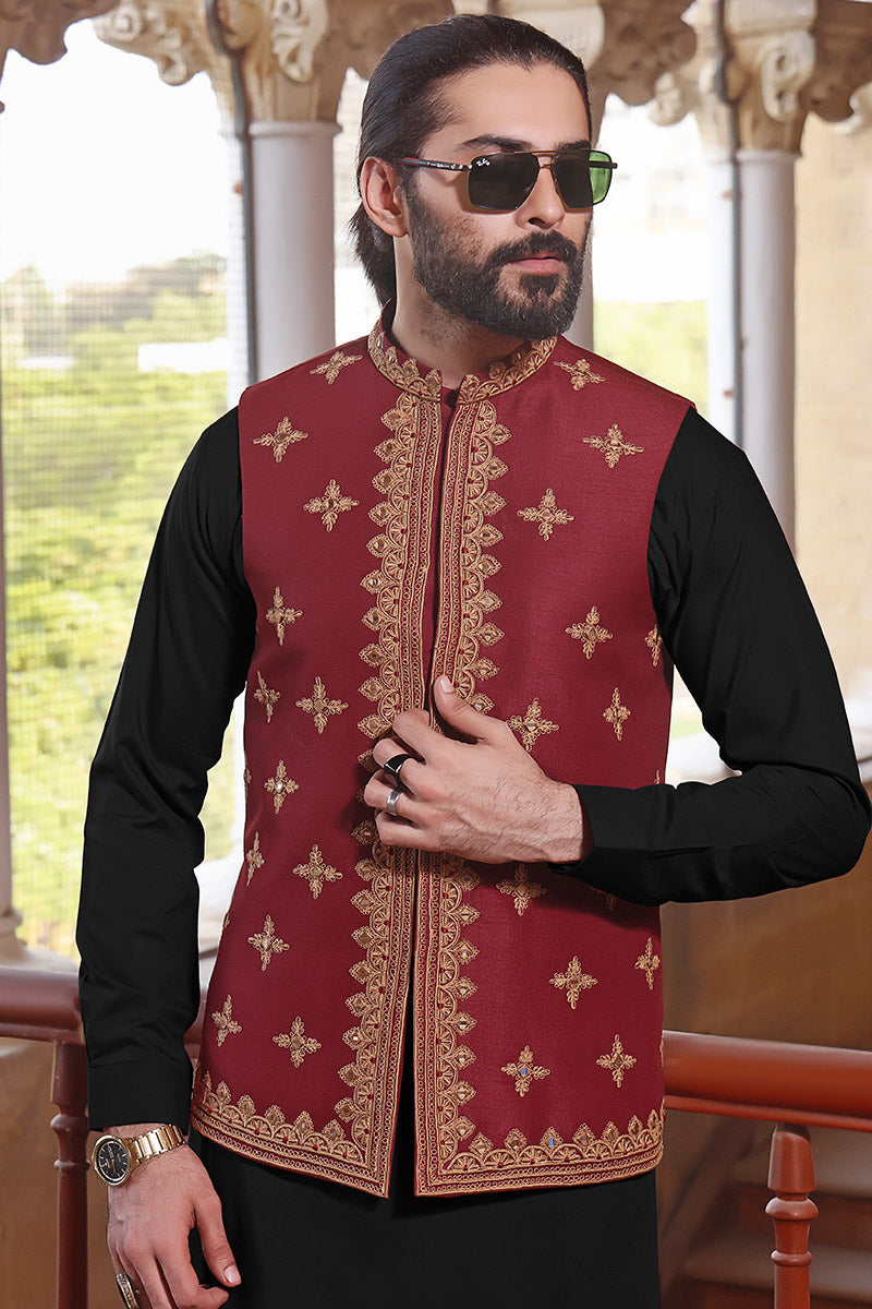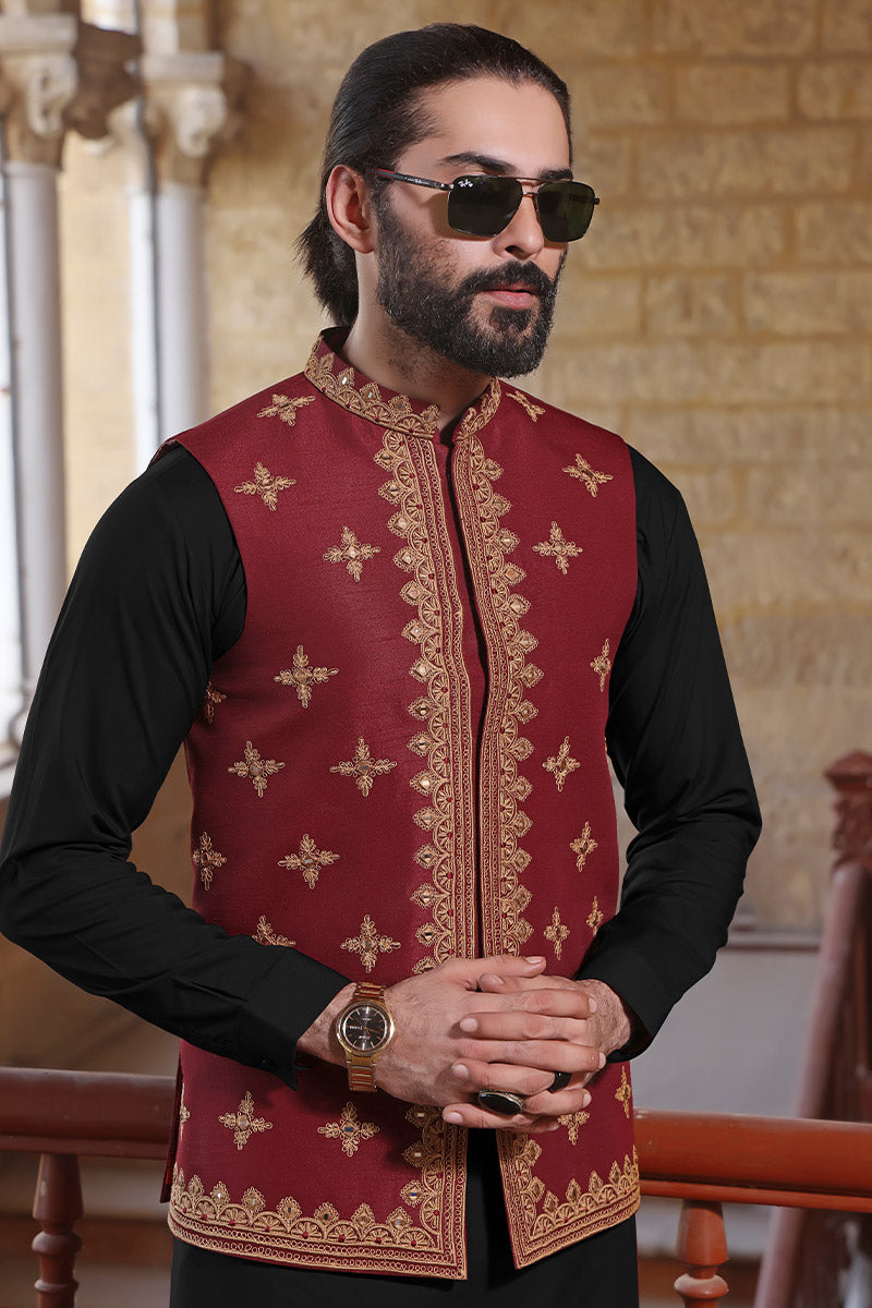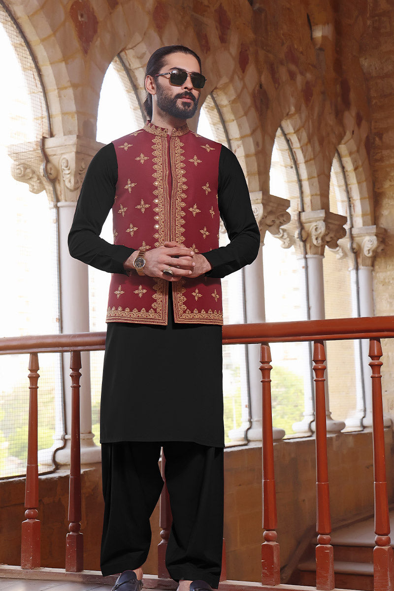Men's Formal Raw Silk Hand Embroidered Waistcoat with Contrast Blended Kameez Shalwar .