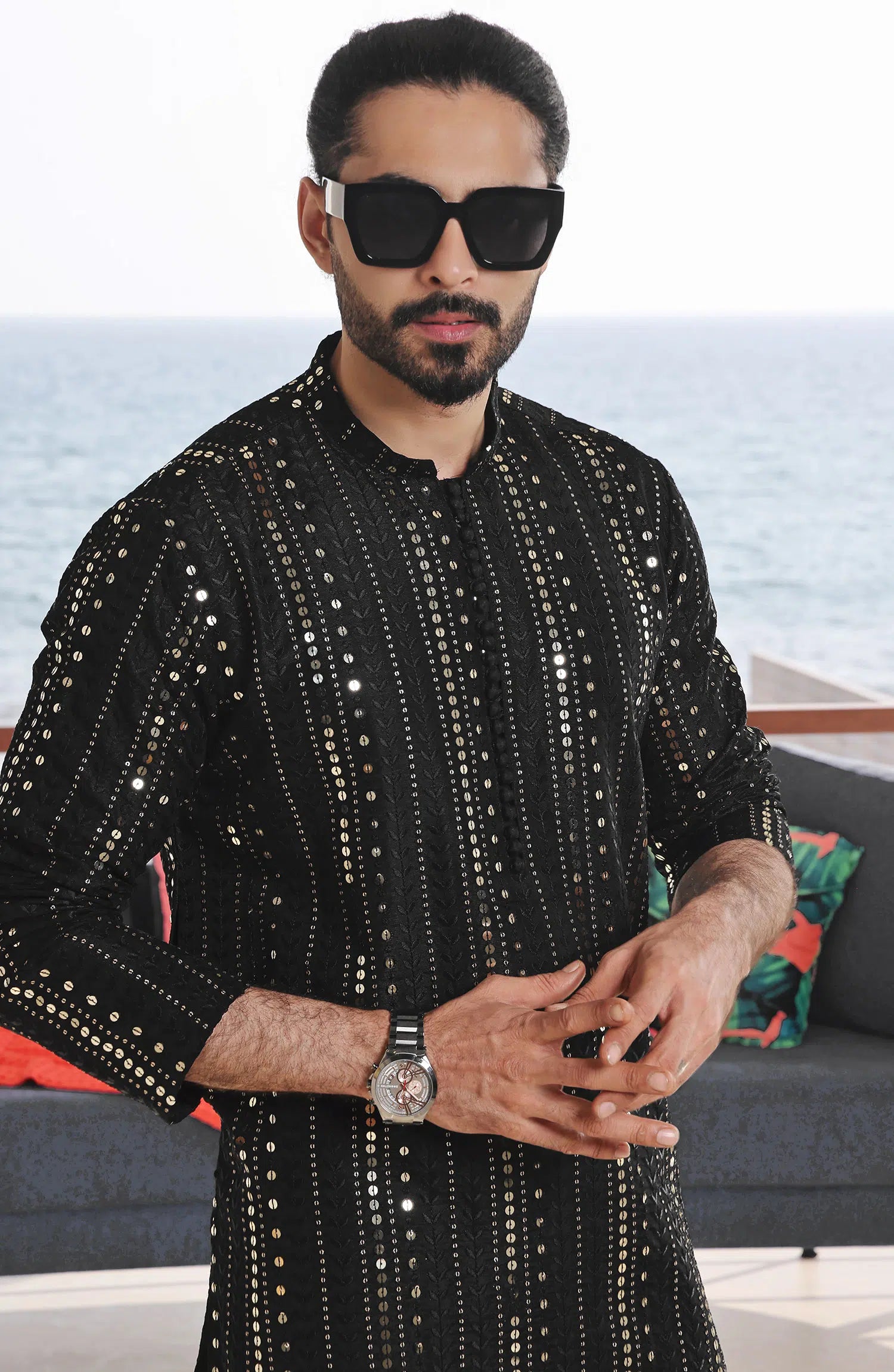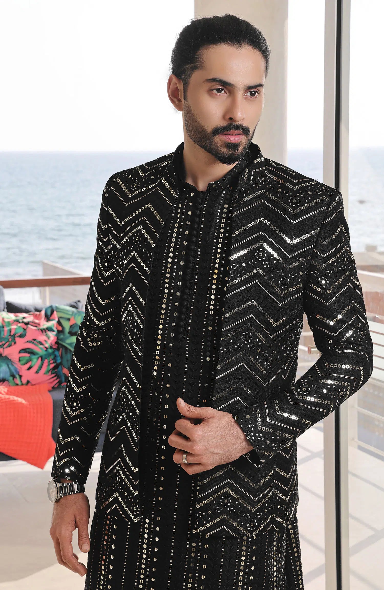 Men's Formal Designer Sequence Kurta Pyjama with Zig Zag Sequence Paired with Matching Prince Coat