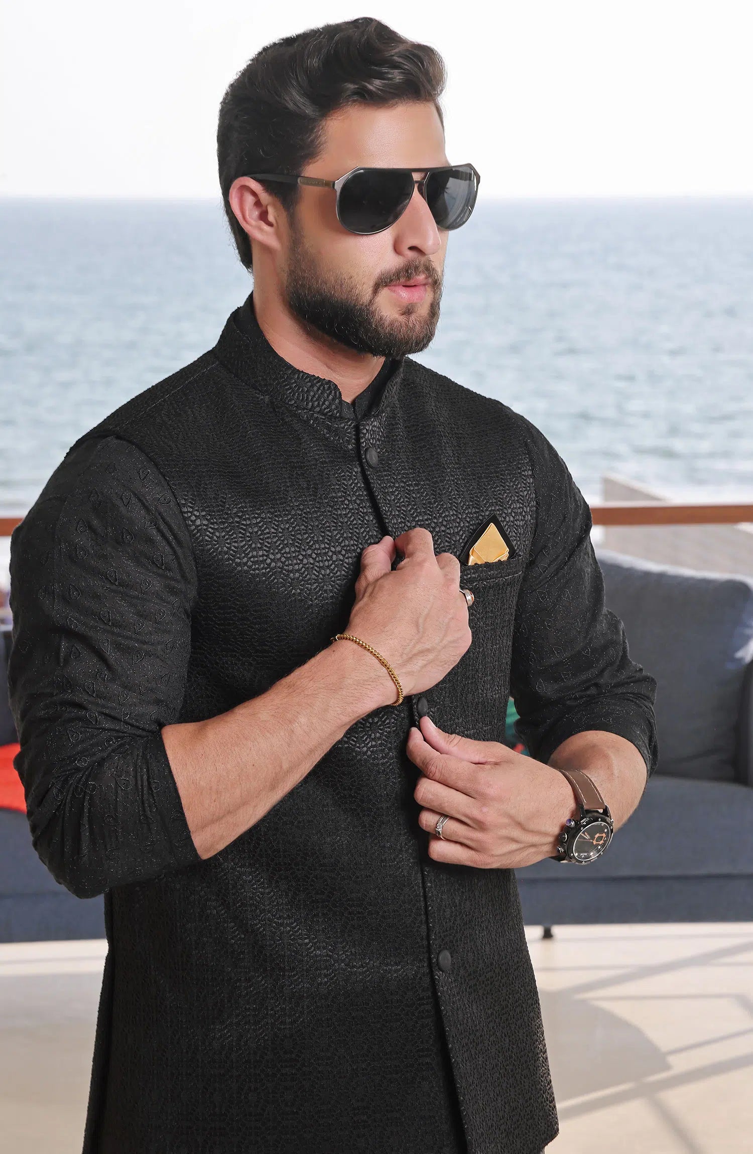 Men's Formal Chikan Fabric Kurta Pyjama with Suiting Textured Waistcoat