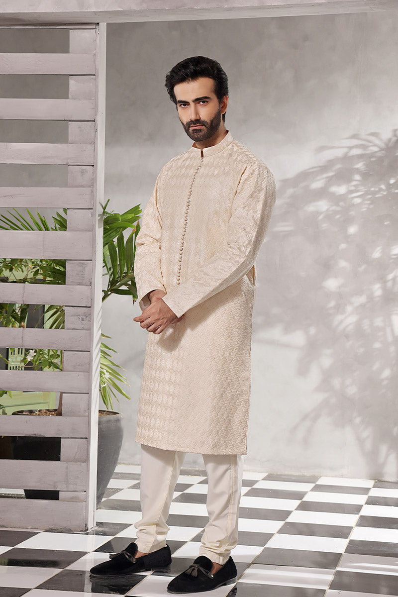 Men's Fancy Kurta Pyjama on Jamawar Fabric with Chikan Embroidery