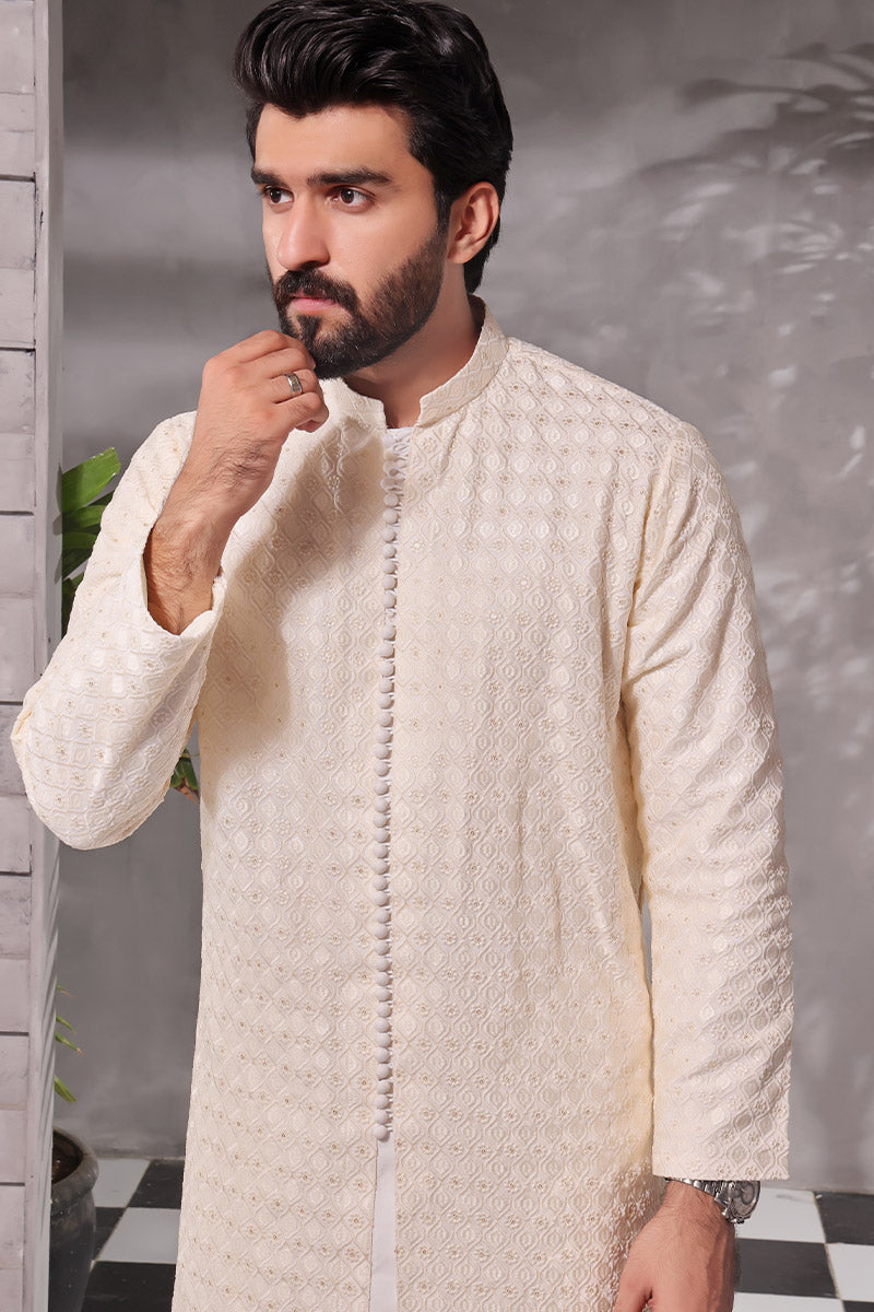Men's Front Open Kurta Pyjama on Jamawar Fabric with Chikan Embroidery