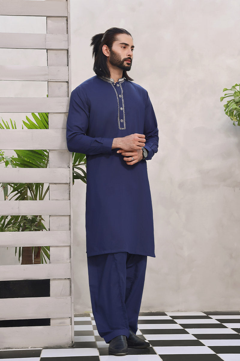Men's Kurta Shalwar with Handwork on Collar and Front