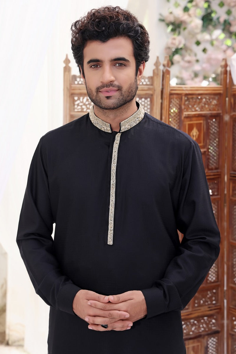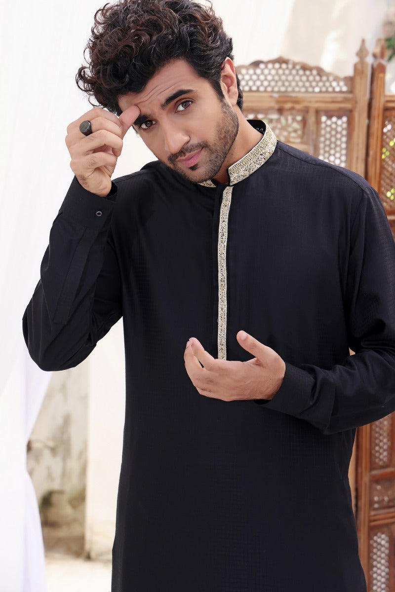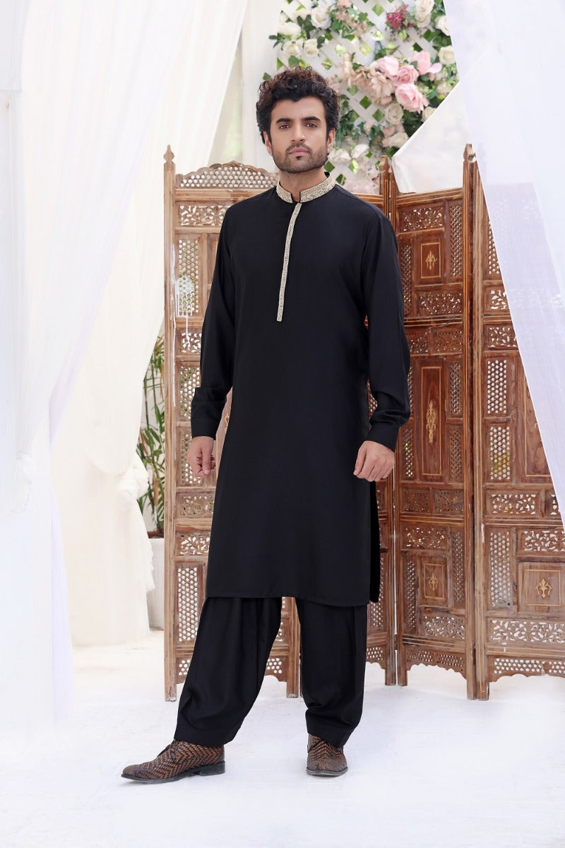 Men's Formal Kameez Shalwar with Hand Embroidery on Collar and Planket
