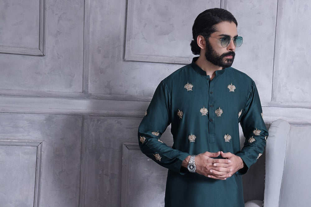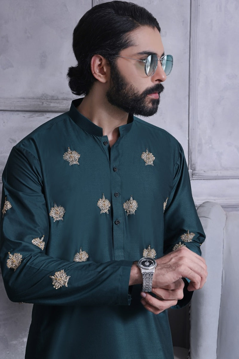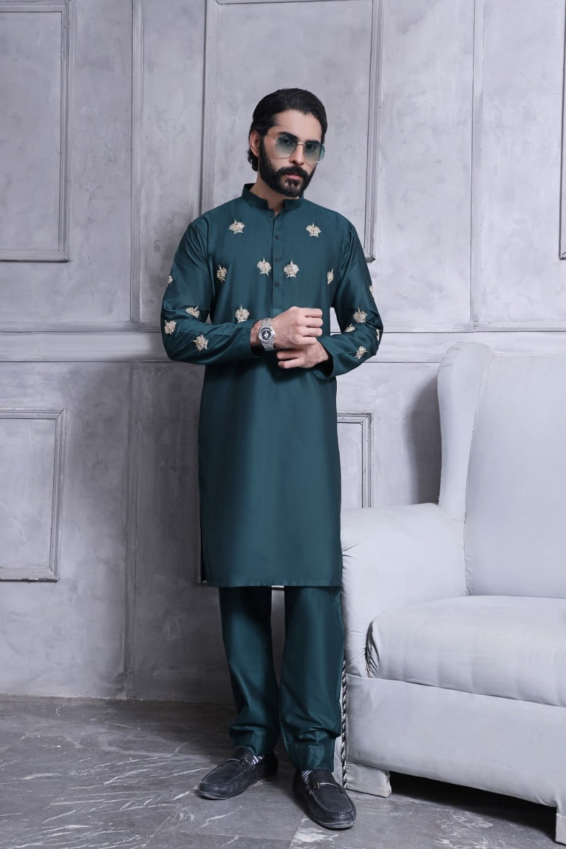 Men's Formal Kameez Shalwar with Hand Embroidered Bunch on Front and Sleeves