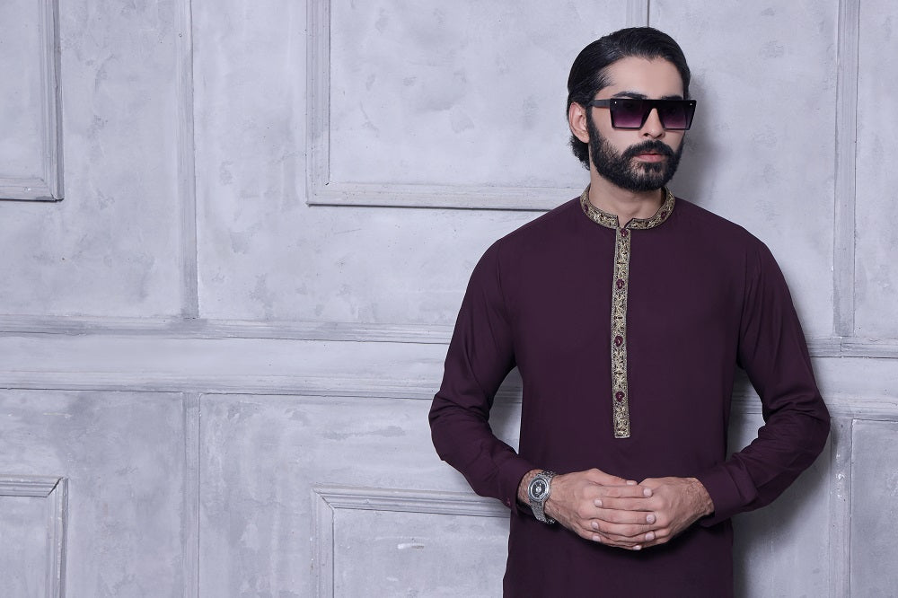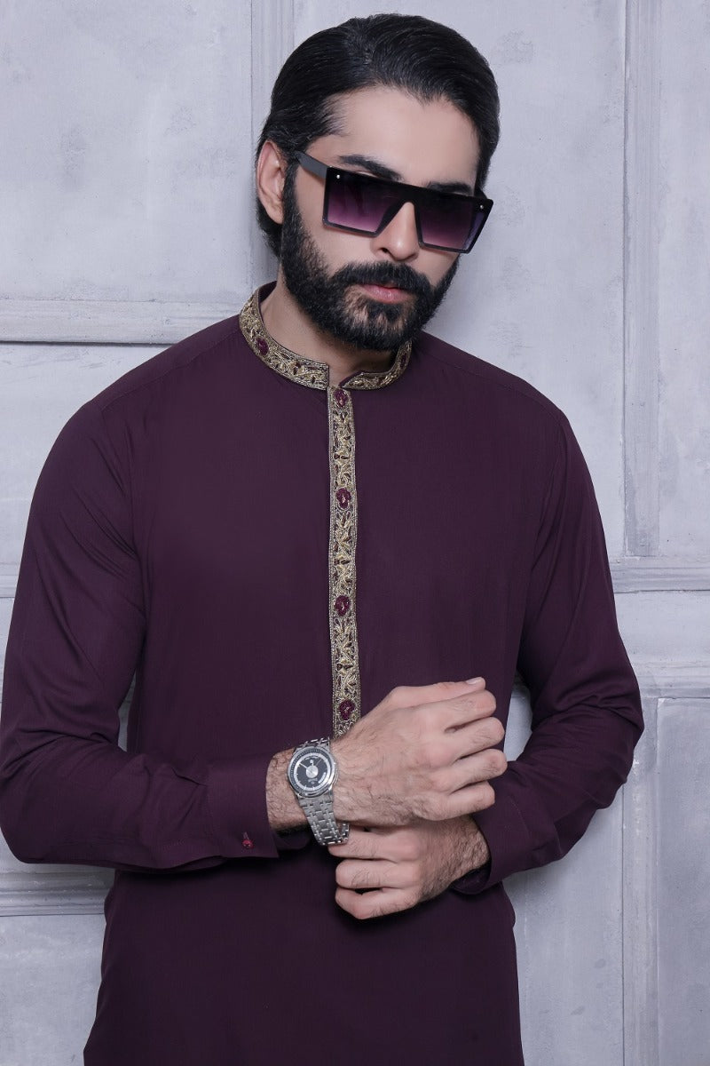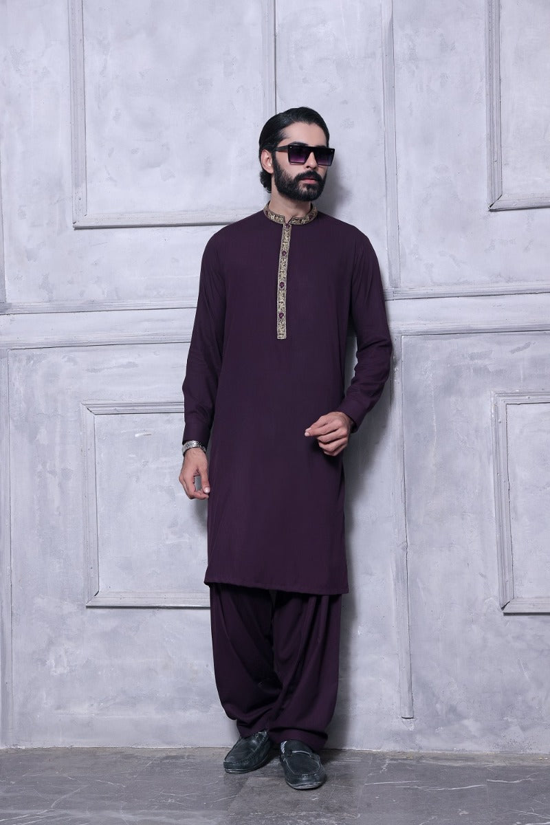 Men's Formal Kameez Shalwar with Hand Embroidery on Collar and Planket