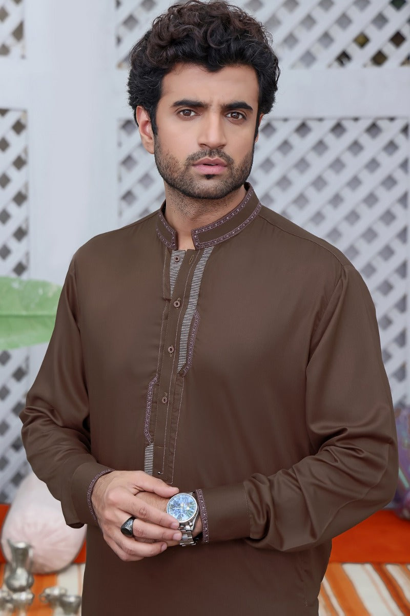Men's Formal Kameez Shalwar with Embroidery on Collar and Planket