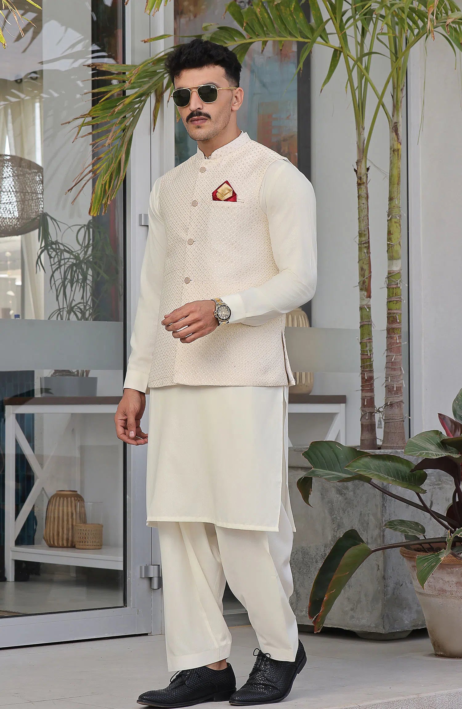 The standard style comes as a 3 Pcs Mens Shalwar Kameez with Coat .