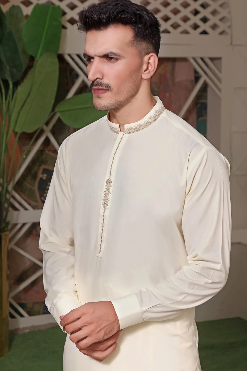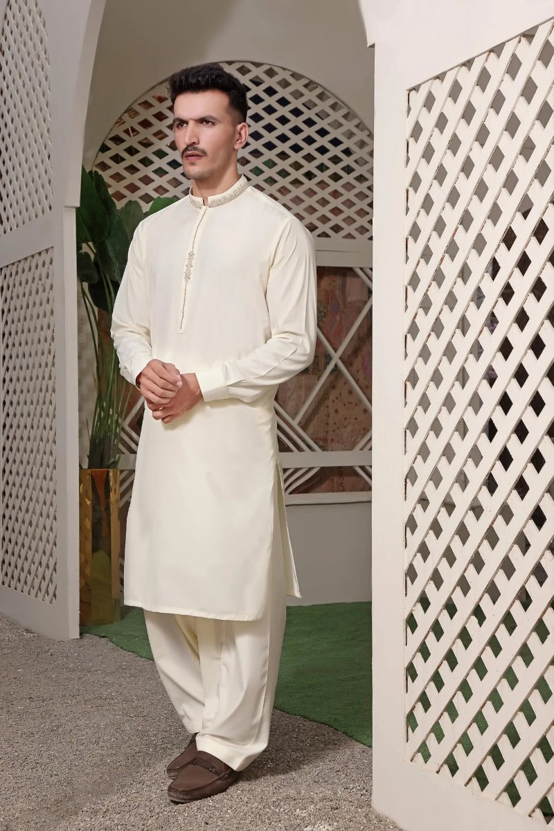 Men's Formal Kameez Shalwar with Hand Embroidery on Collar and Planket