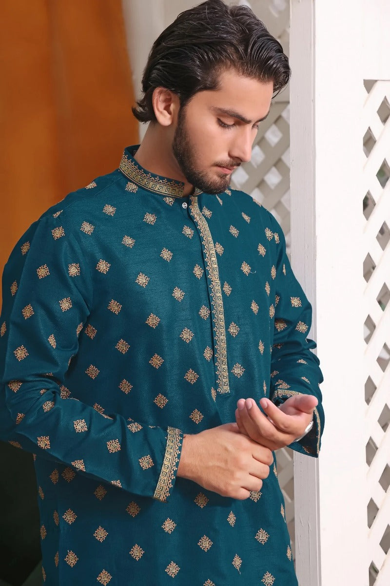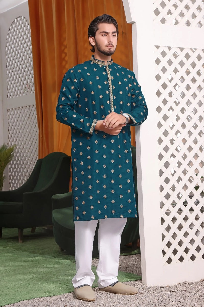 Men's Formal Kurta Pyjama On Raw Silk with Computer Embroidery with Booti work and white Pyjama