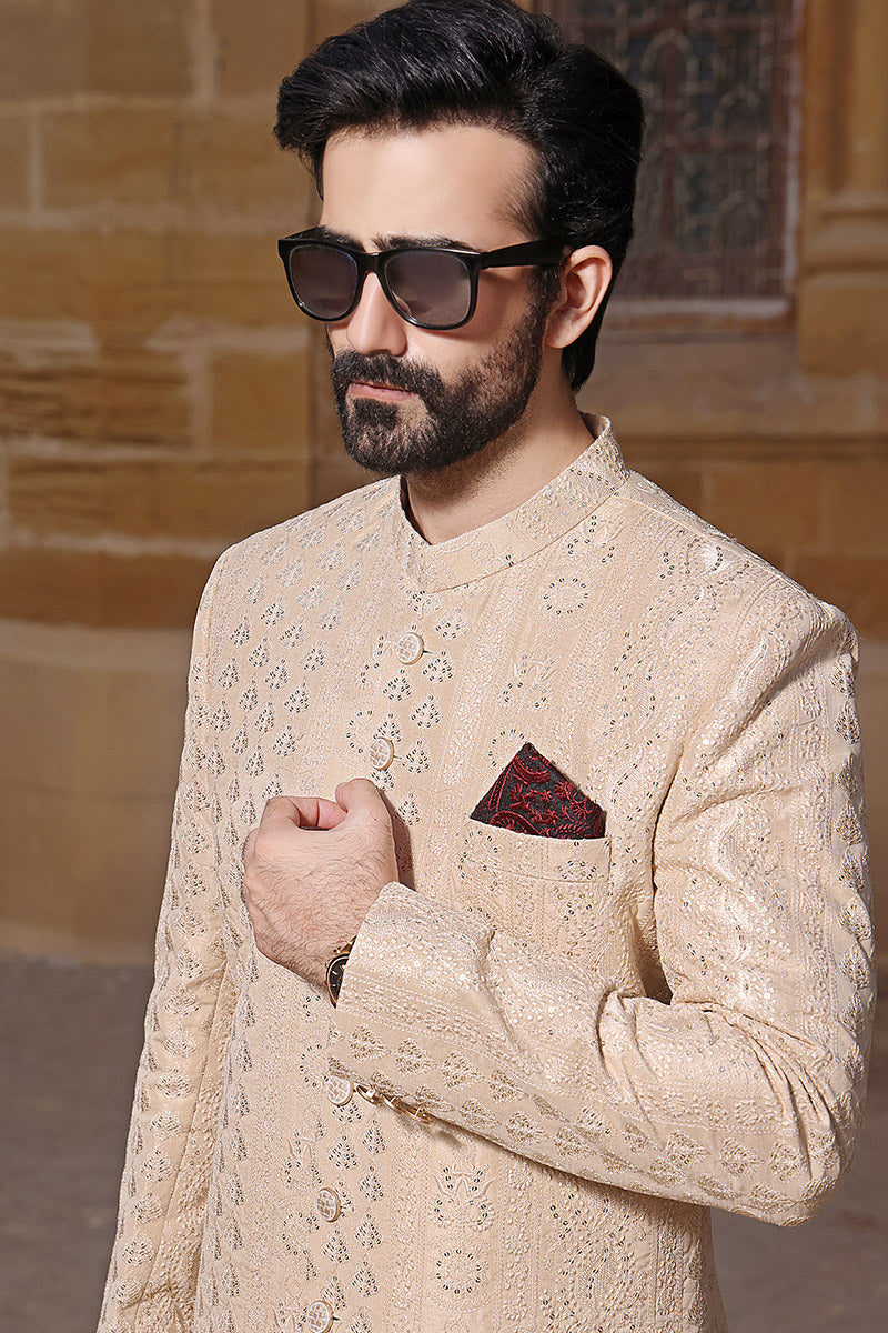 Men's Formal Raw Silk Sherwani with Chikan Embroidery and Pyjama along with it