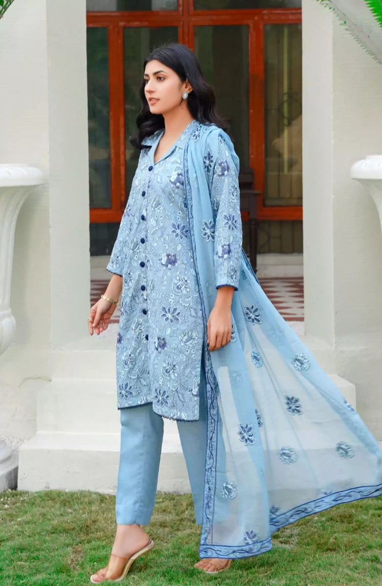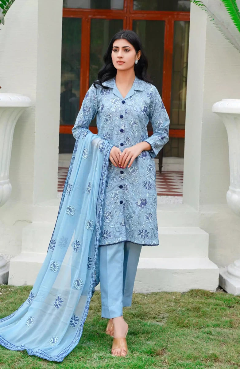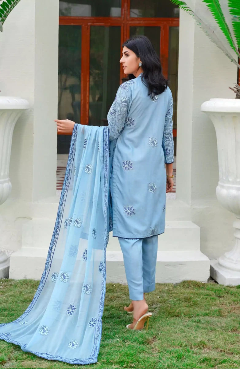 Modest Embroidered Chiffon Stitched 3 Piece Suit - 9825-Blu - MOD25PRF - Blue - Festive Girls Collection