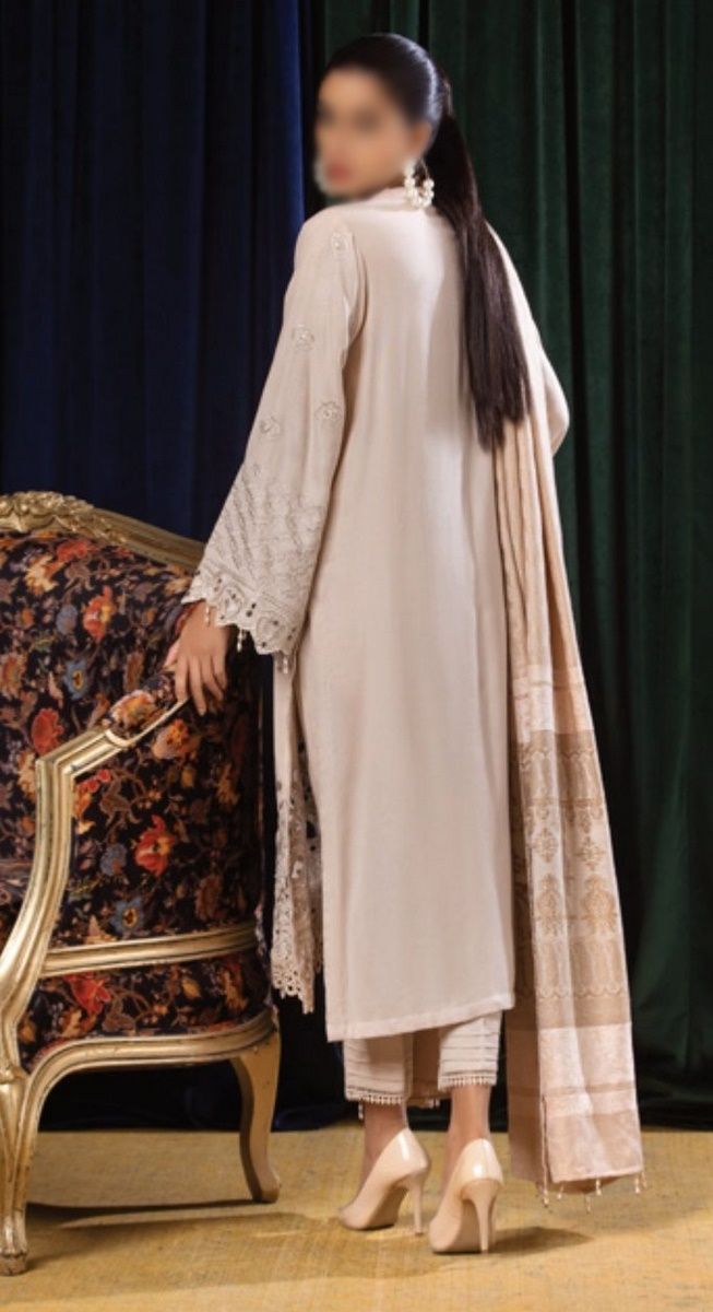 Tehzeeb Embroidered Leather Peach With Velvet Jacquard Shawl Collection by Riaz Arts Vol-01 has been styled in the image for photography and illustrative purposes.