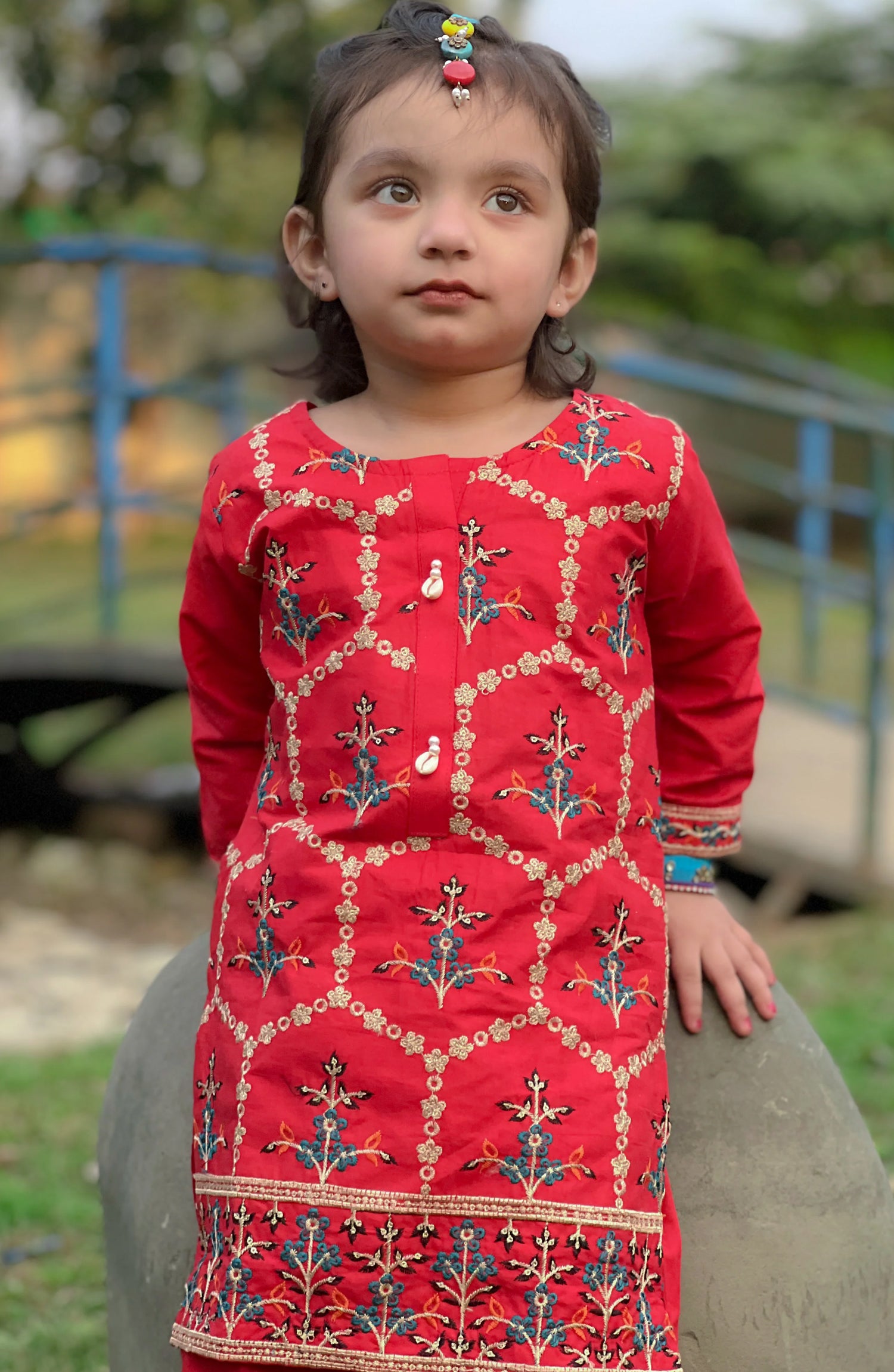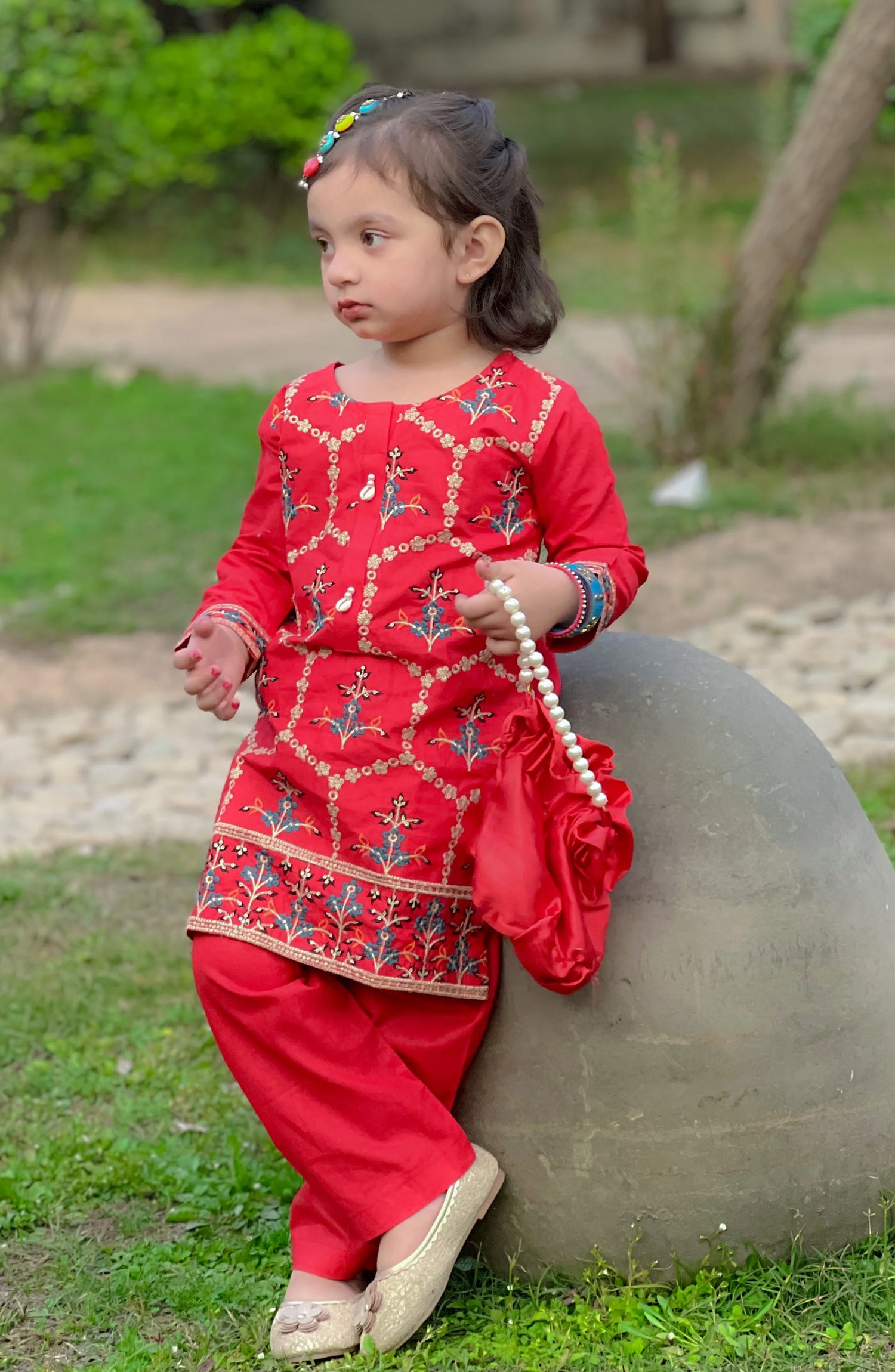 Fabric: Cotton Pattern:embroidered Color: Tomato Red Design/Cut: 2-Pcs Straight Shirt and Trouser This product is designed for all seasons.