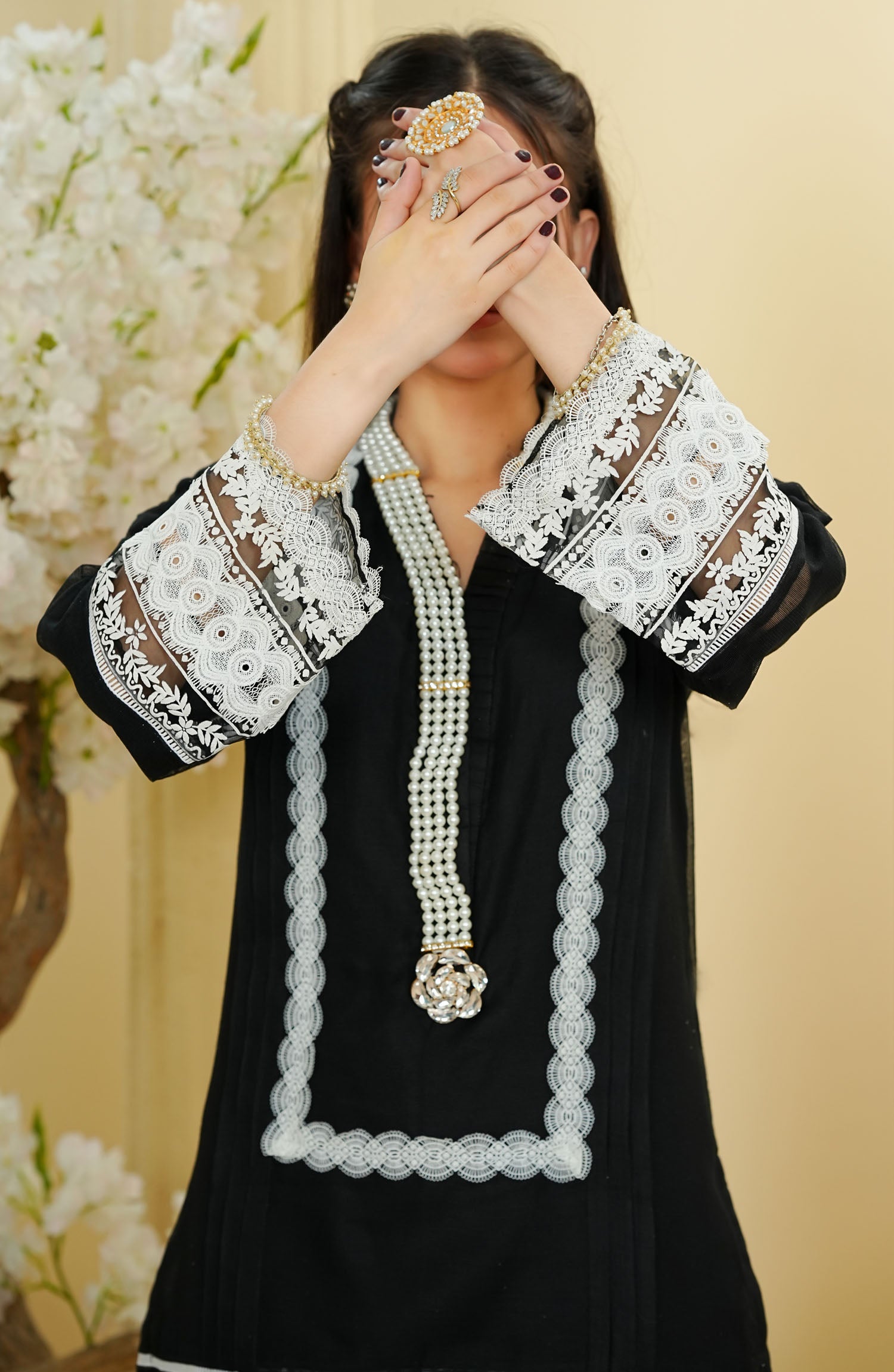Exclusive Khaddi Net Stitched Shirt with lace and pearl work with embellishments