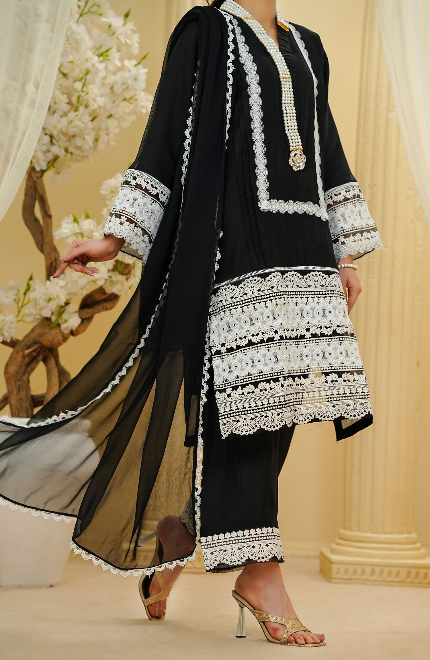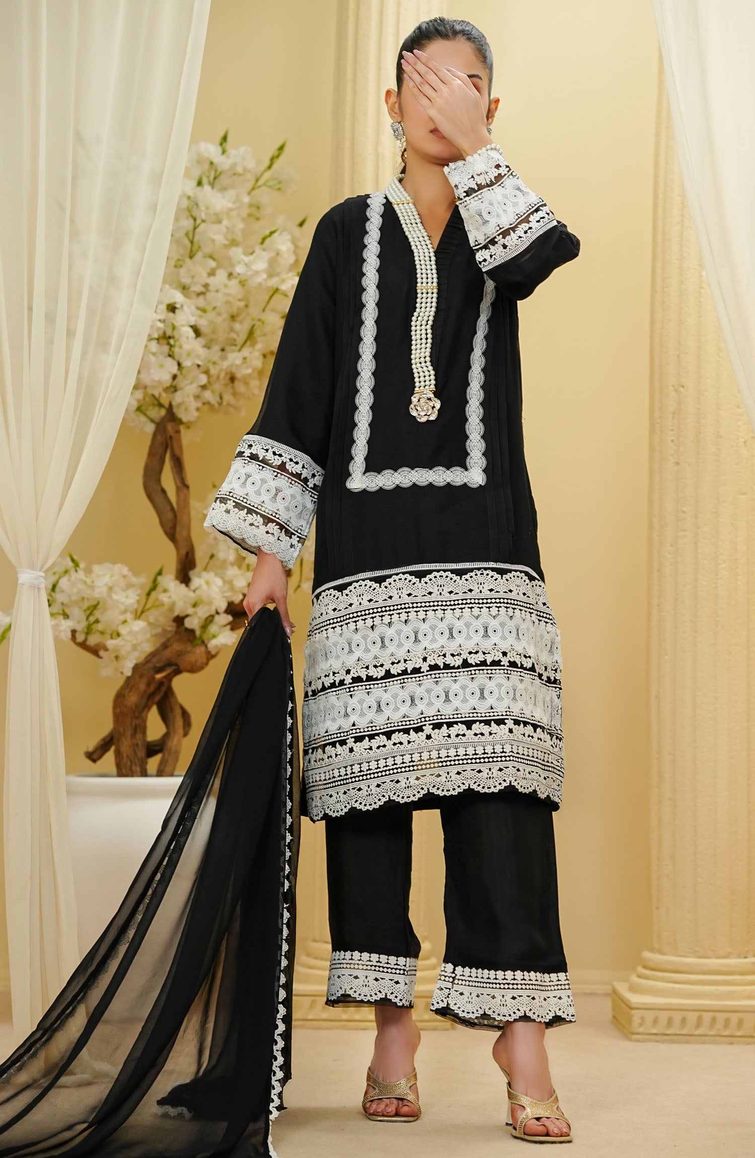 Home Veloure by Amna Khadija Embroidered Khaadi Net Stitched 2 Piece Suit - VLEPEW-01A - AM52VLEPEW - Black - Festive Collection