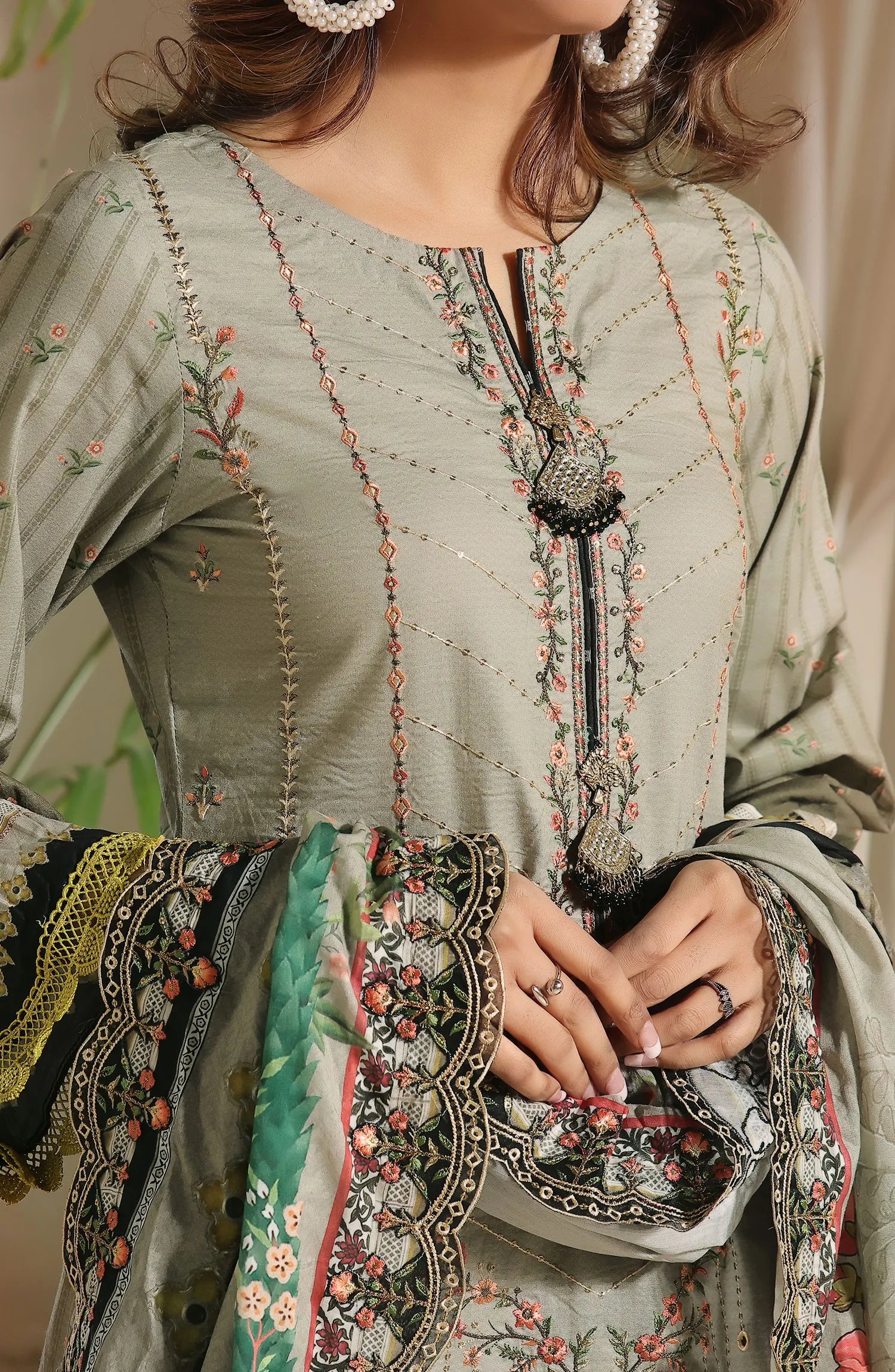 Modest Embroidered Chiffon Stitched 3 Piece Suit - 9740-Grn - MOD25PRF - Green - Festive Girls Collection