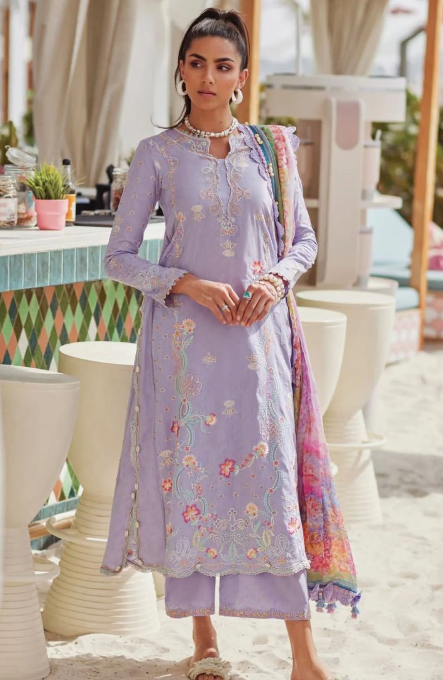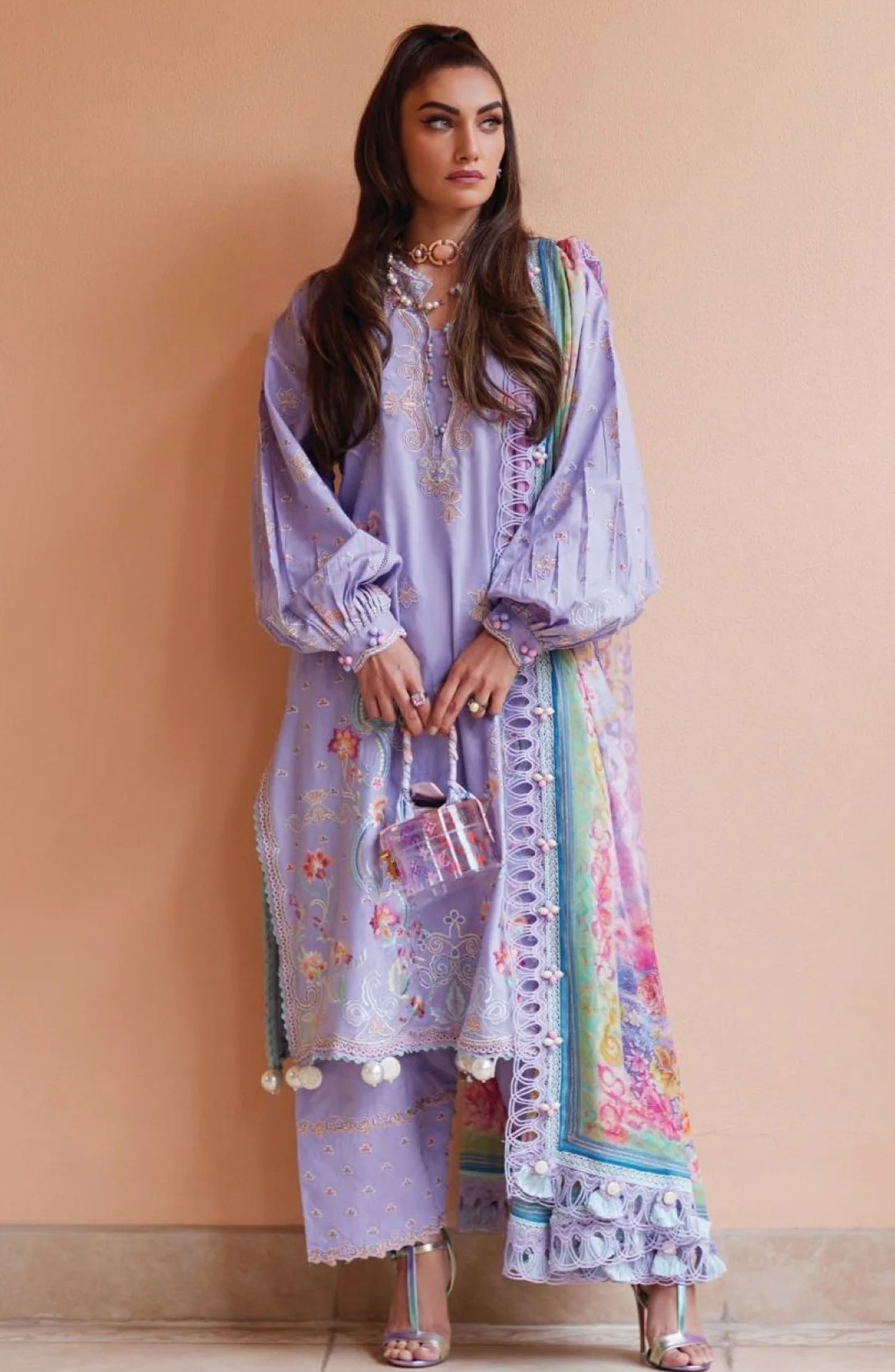 The standard style comes as a long-sleeved kameez with dupatta and trouser/shawlar.