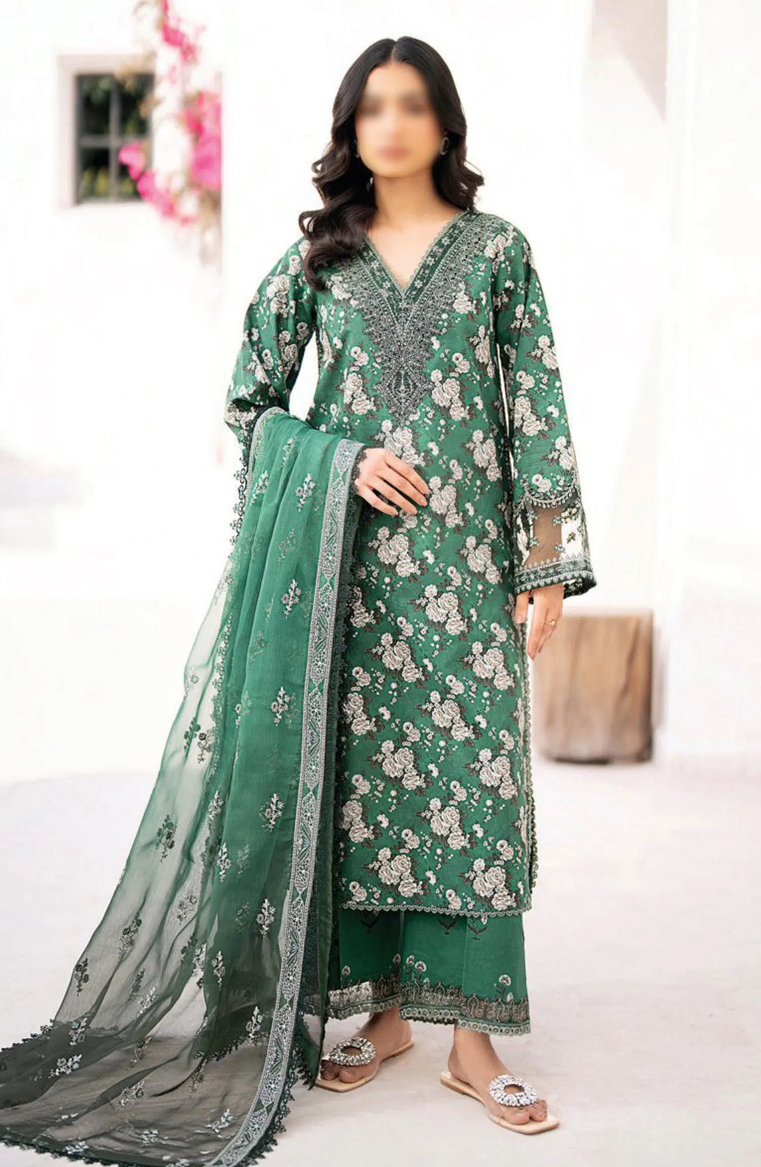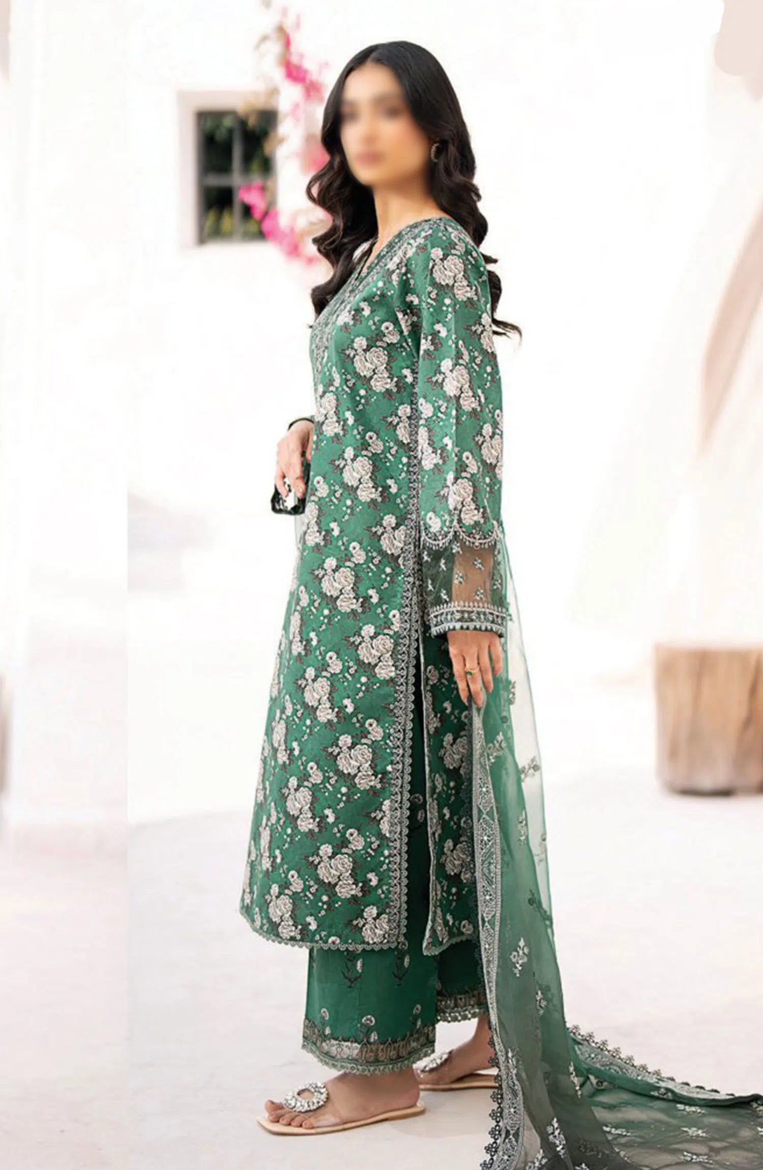 Modest Embroidered Chiffon Stitched 3 Piece Suit - 9740-Grn - MOD25PRF - Green - Festive Girls Collection