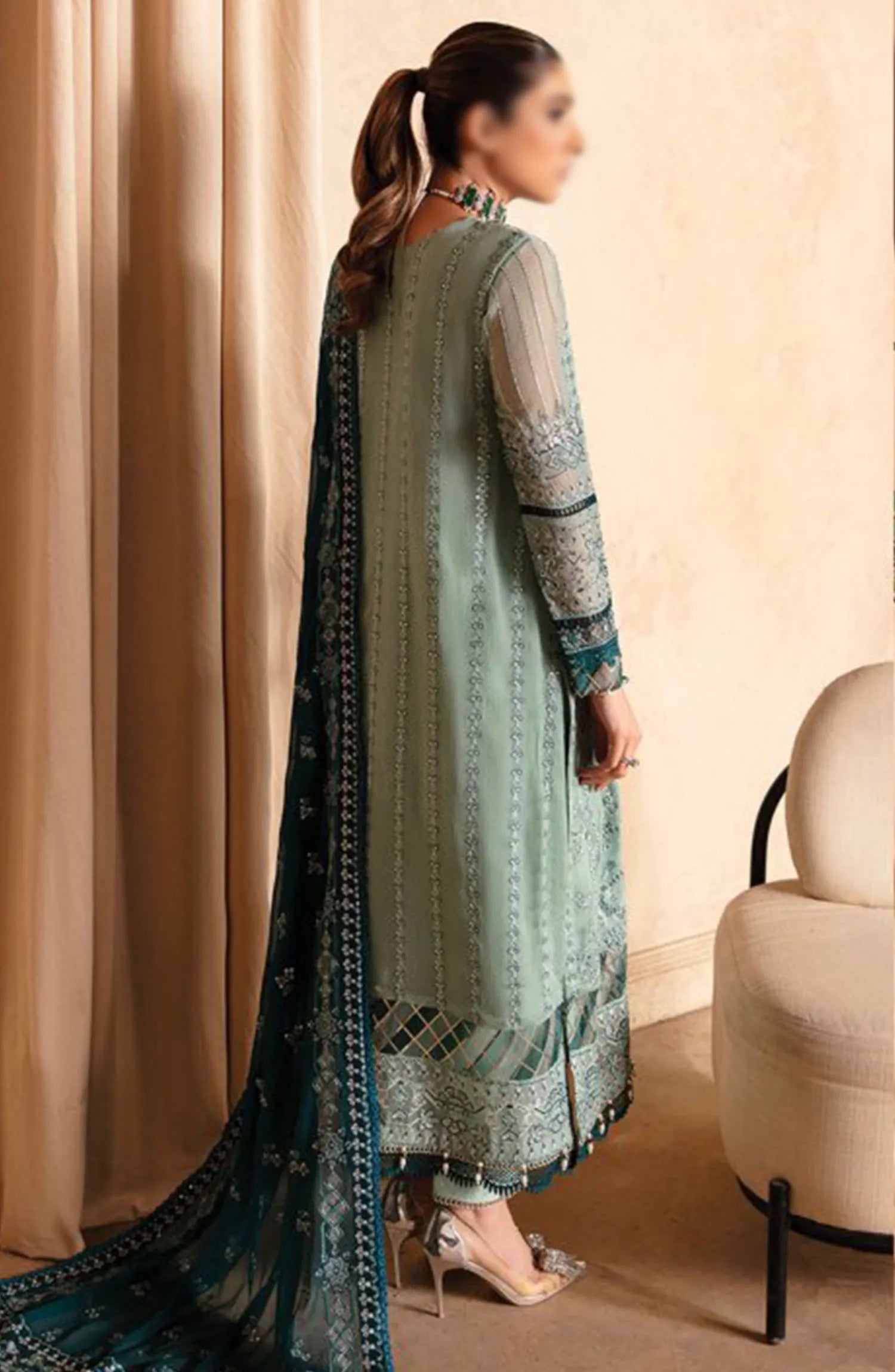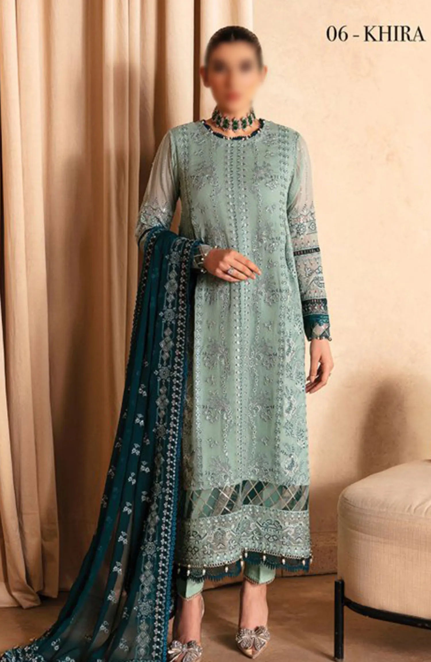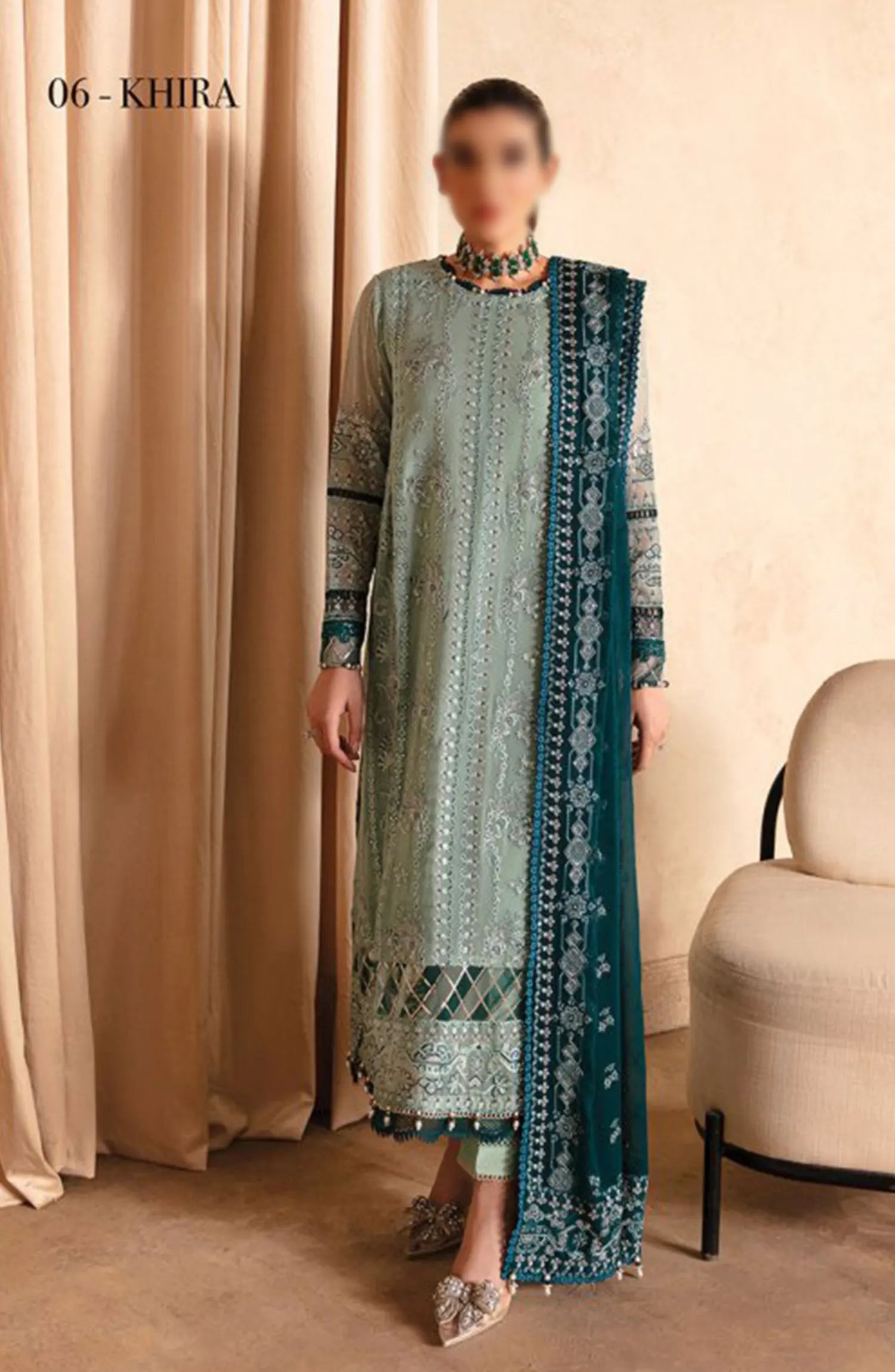 The standard style comes as a long-sleeved kameez with dupatta and trouser/shalwar.