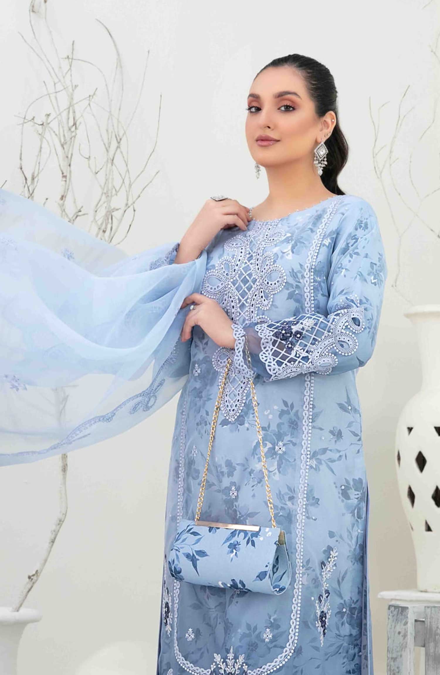 Modest Embroidered Chiffon Stitched 3 Piece Suit - 9840-Cblu - MOD25PRF - Blue - Festive Girls Collection