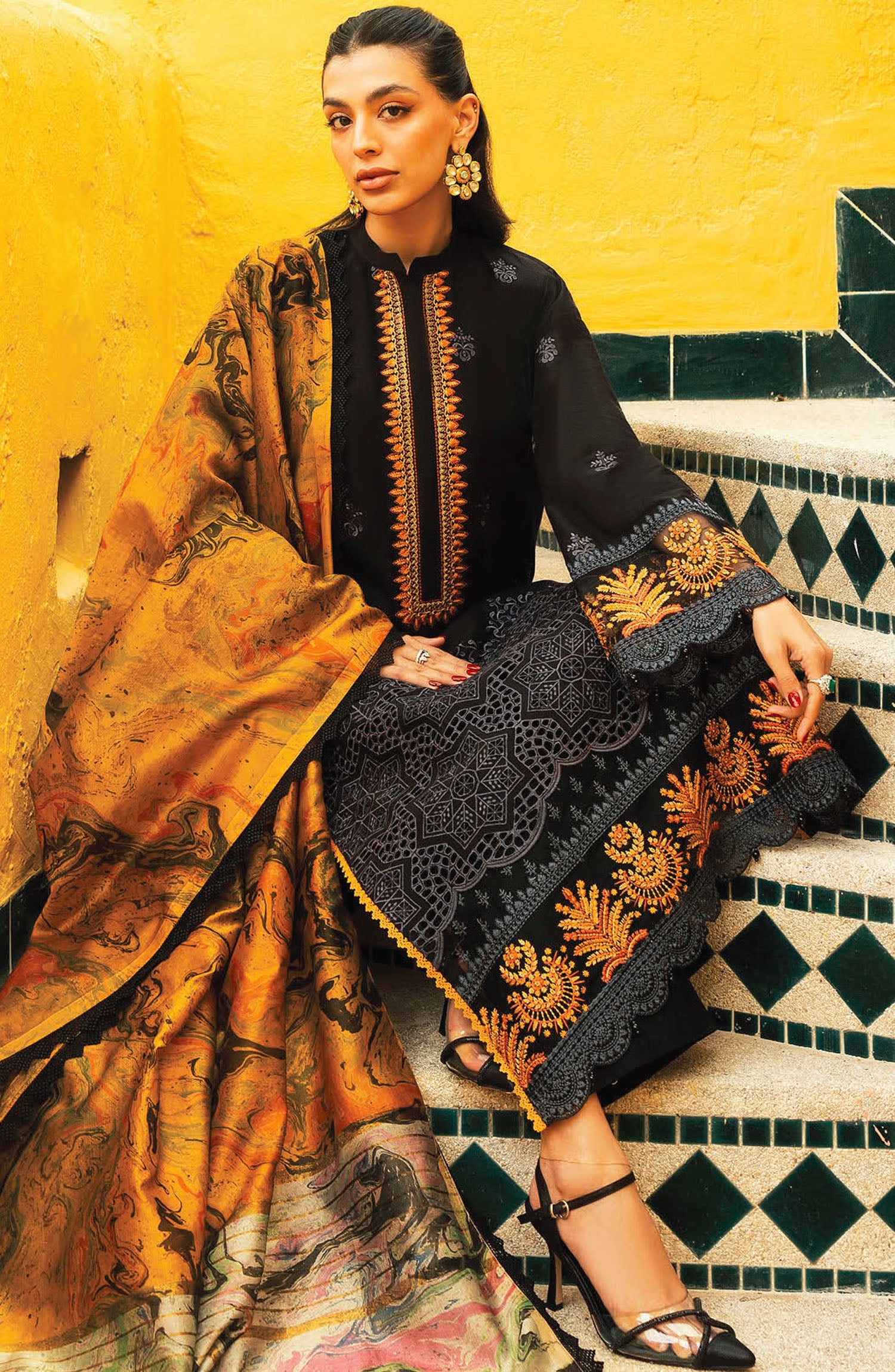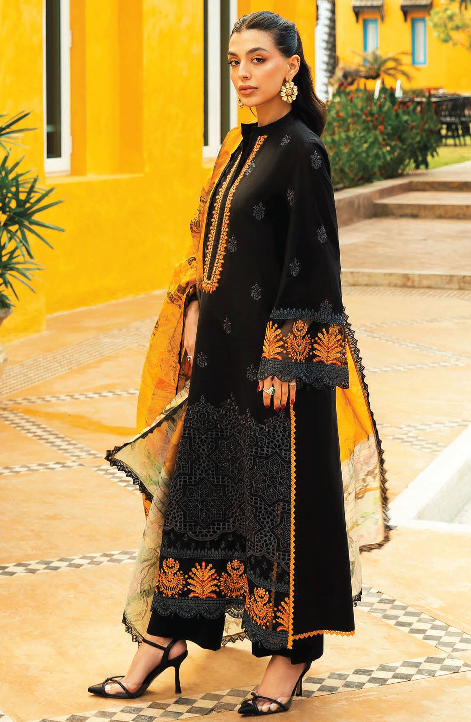 The standard style comes as a long-sleeved kameez with dupatta and trouser/shawlar.