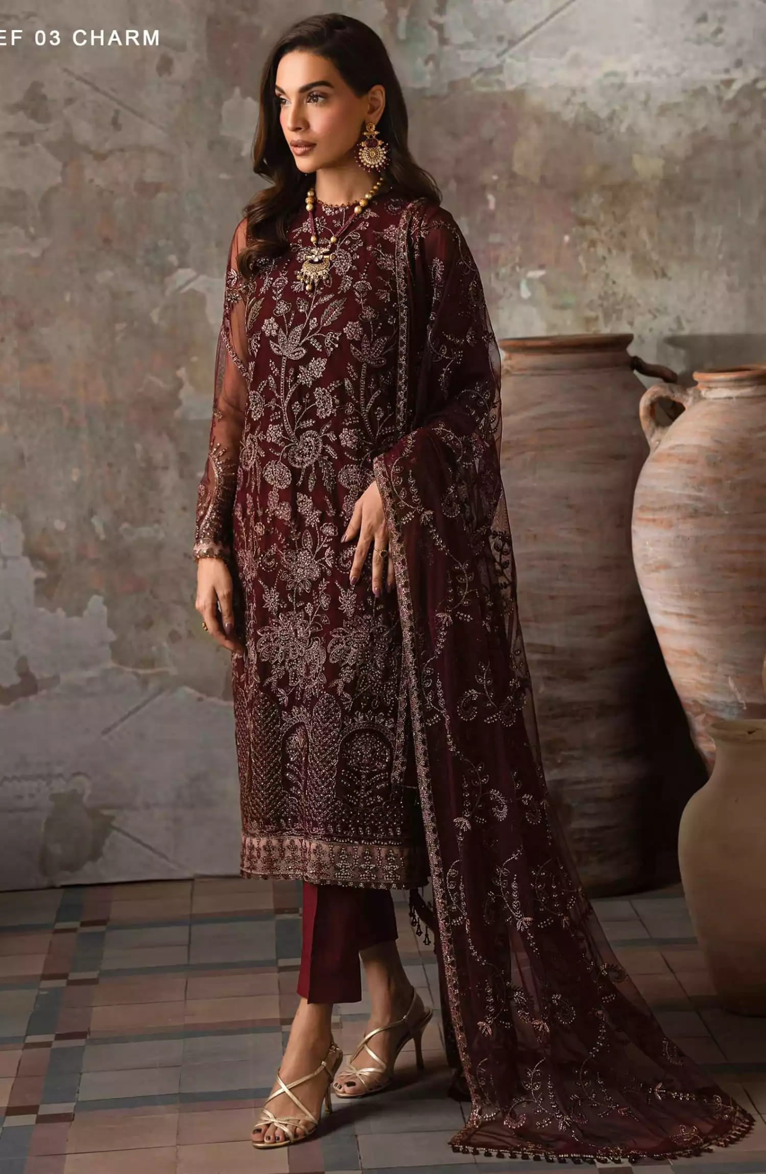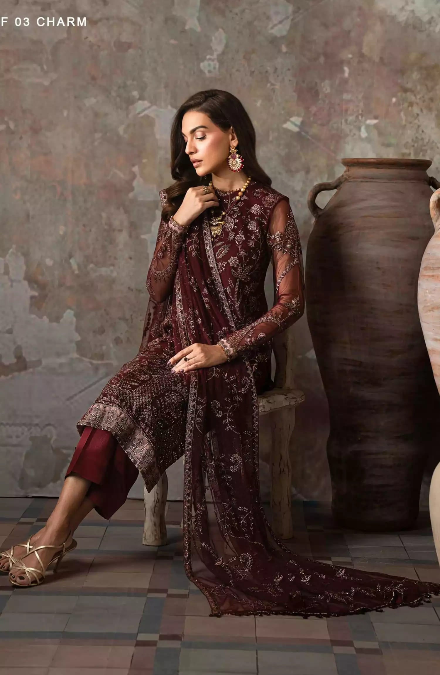 Zarif Emirah Unstitched Formals Collection has been styled in the image for photography and illustrative purposes.