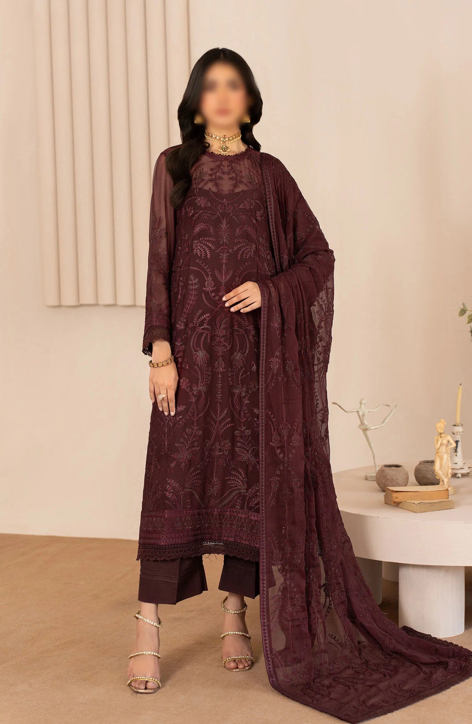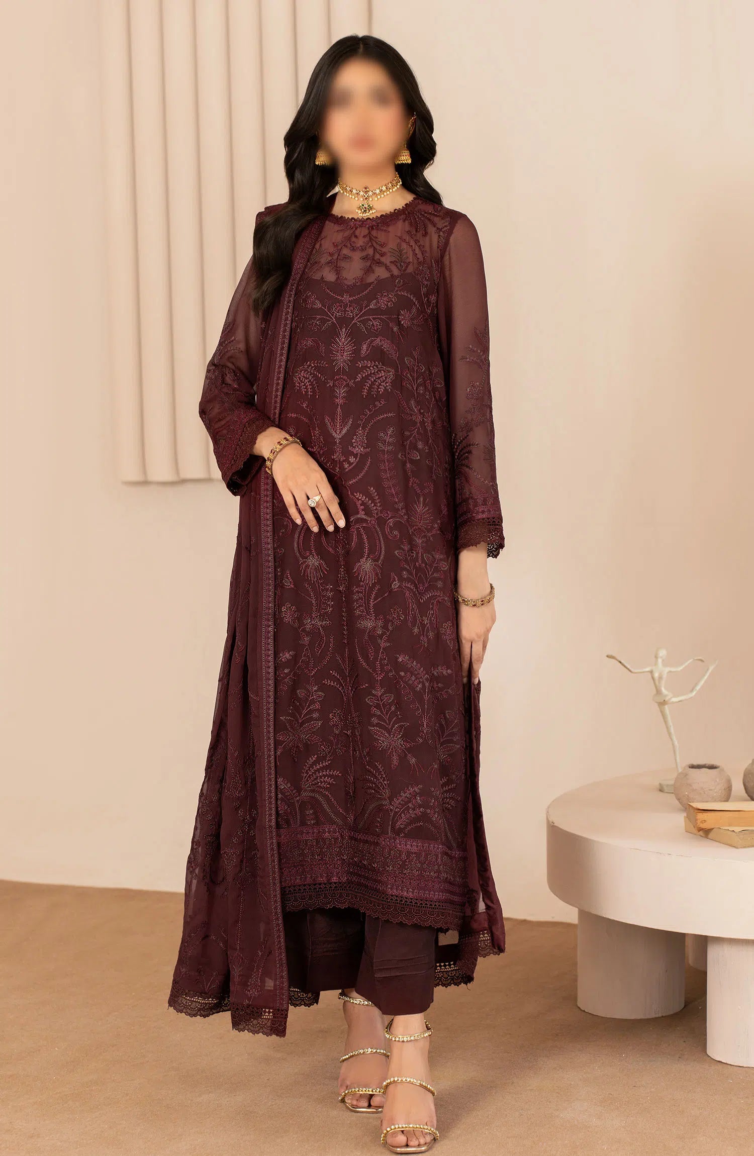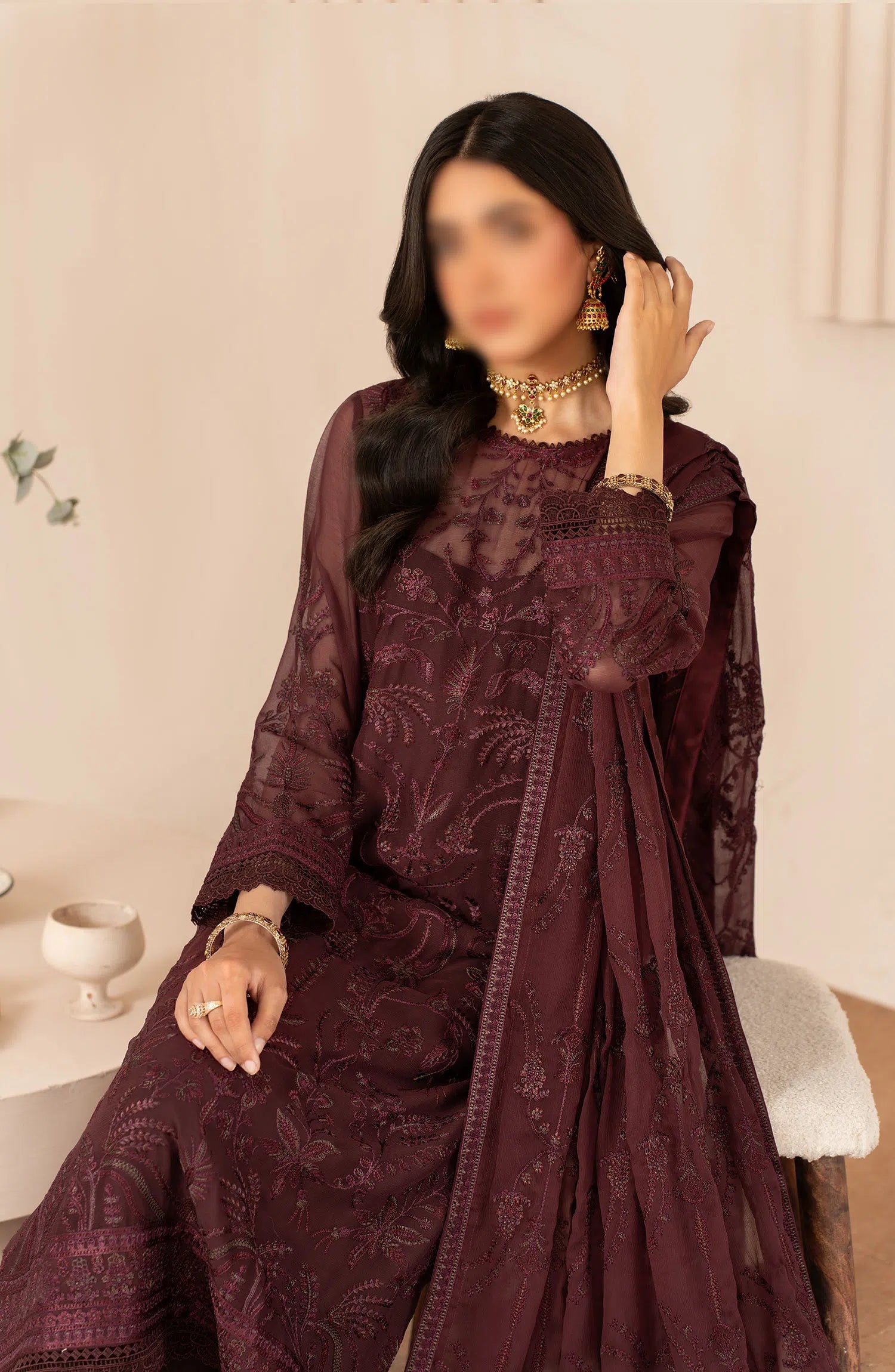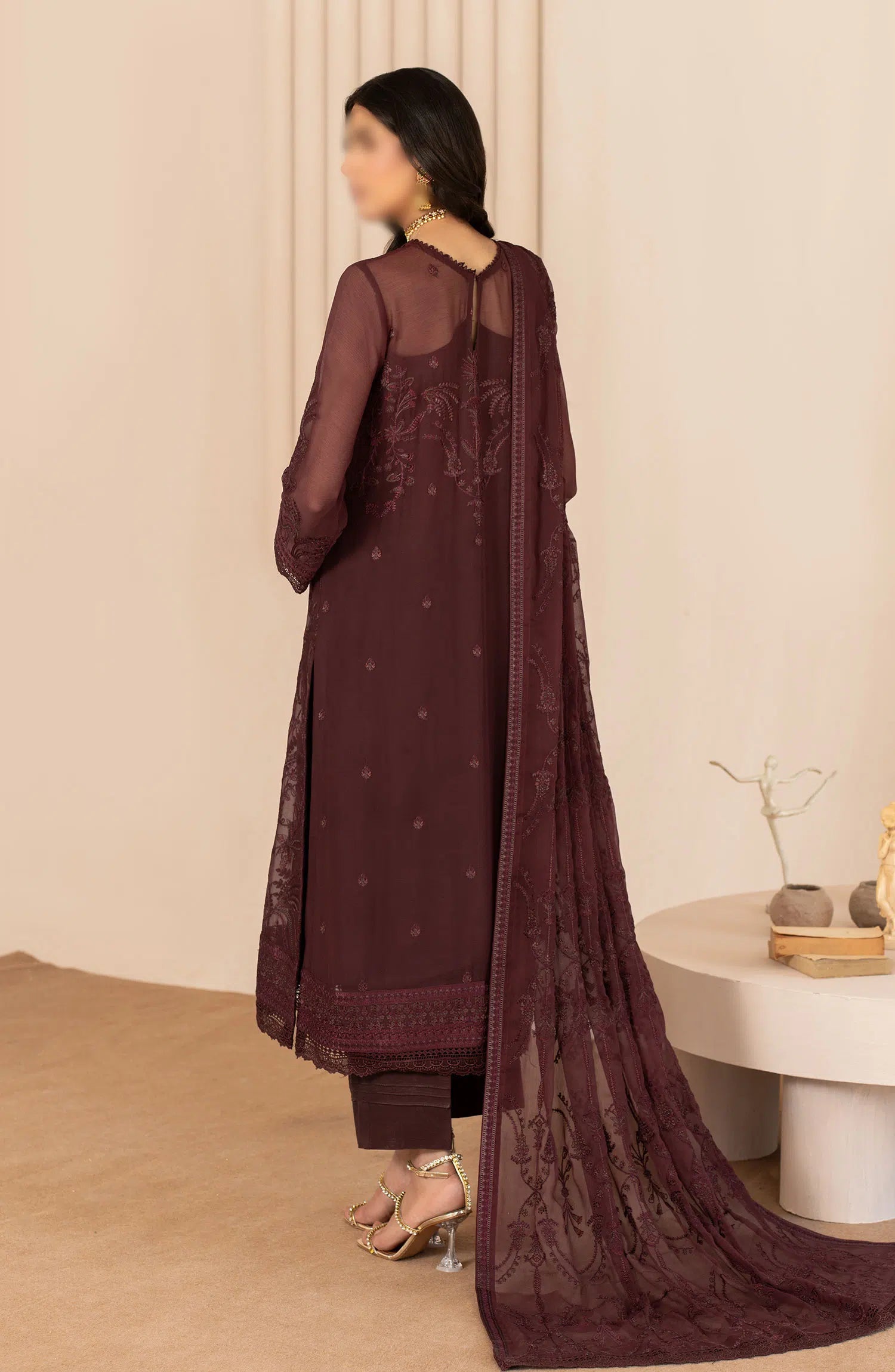 Zarif Thread Work Unstitched Chiffon Edit has been styled in the image for photography and illustrative purposes.