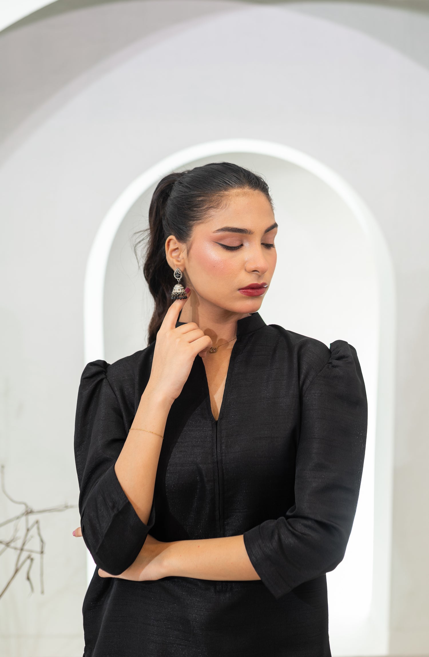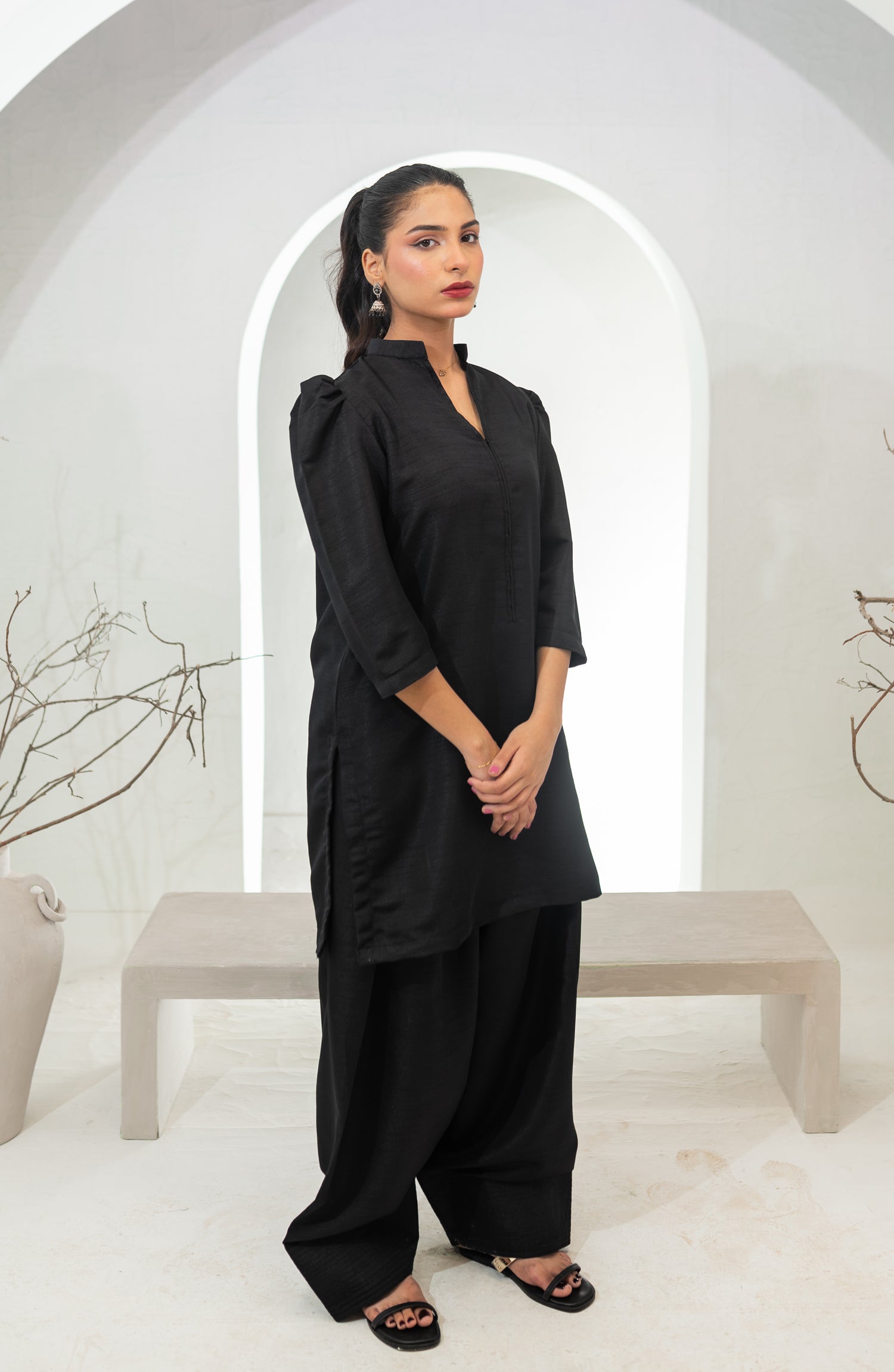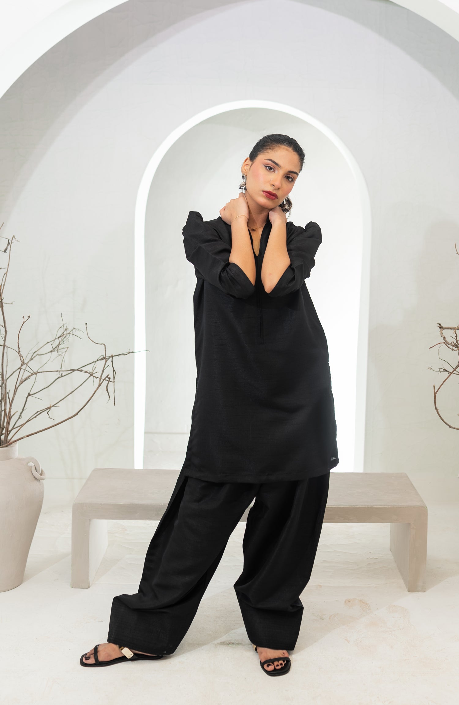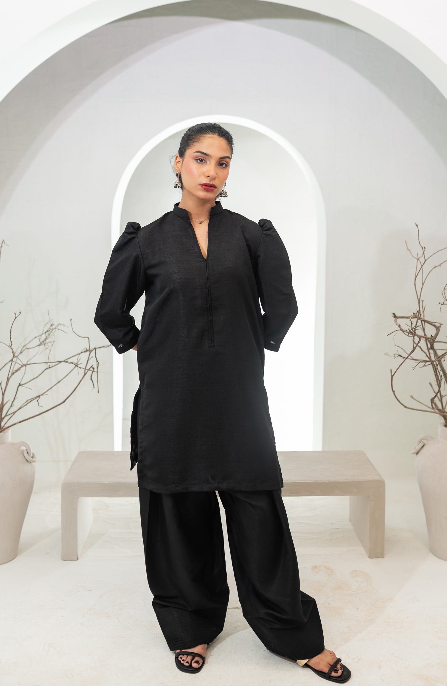 Zauk Basics Solid Printed Raw Silk Stitched 3 Piece Suit - Sable Black Farshi Shalwar Set - ZK25BSO - Casual Collection