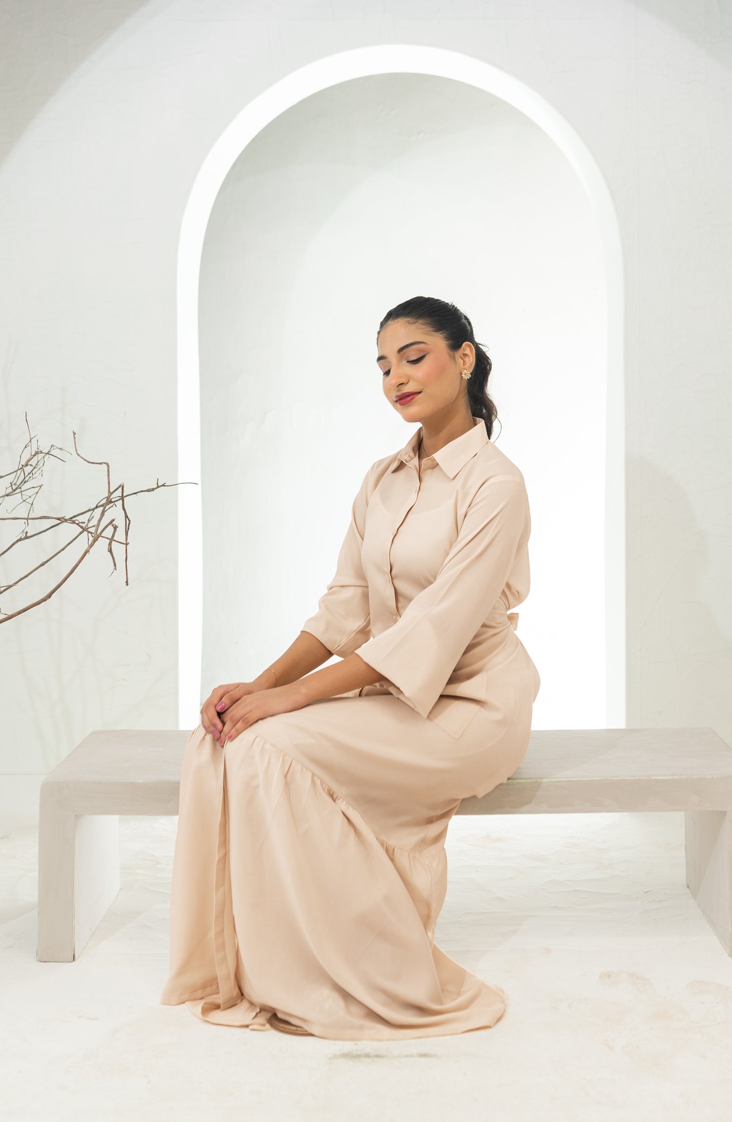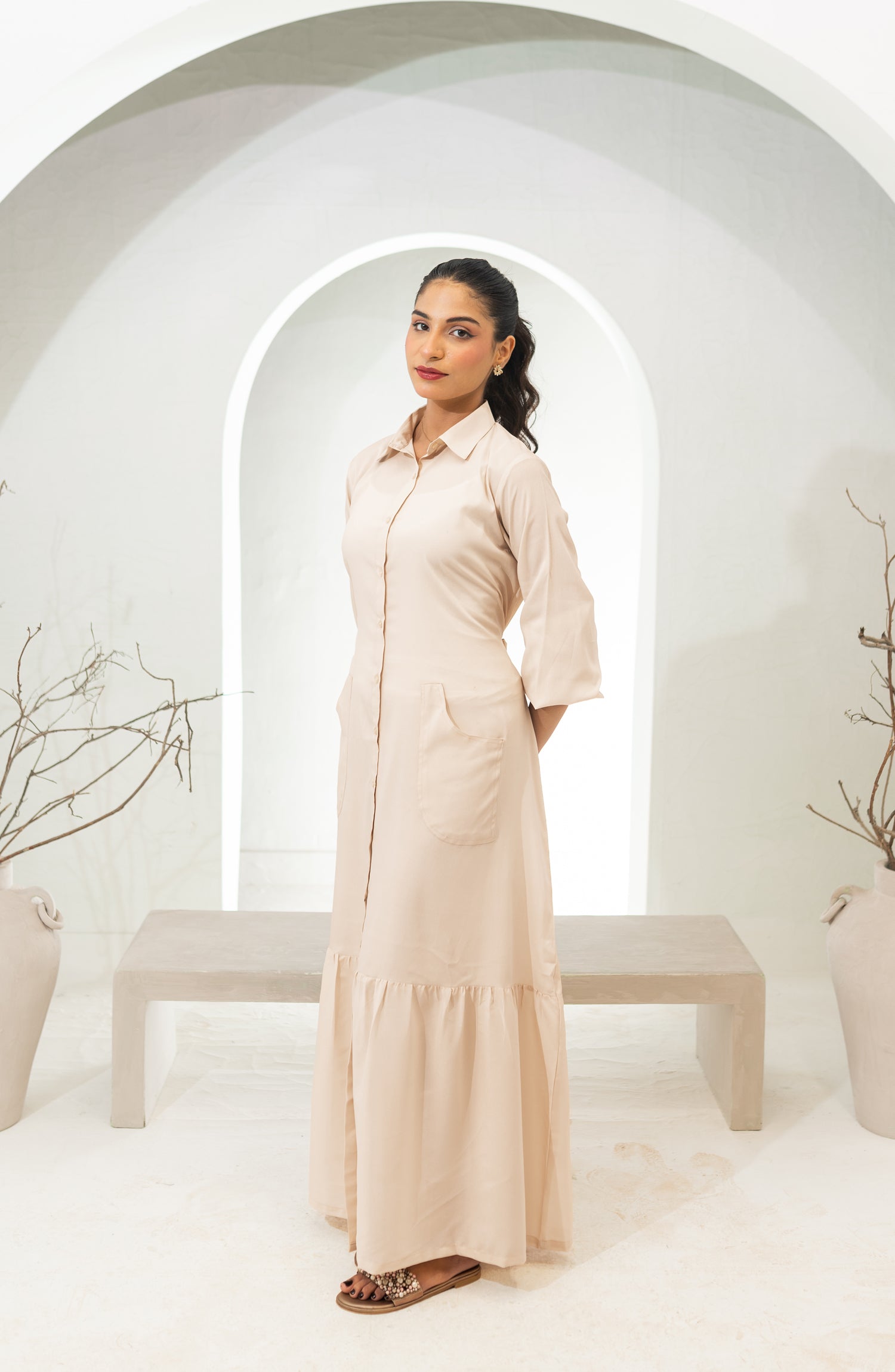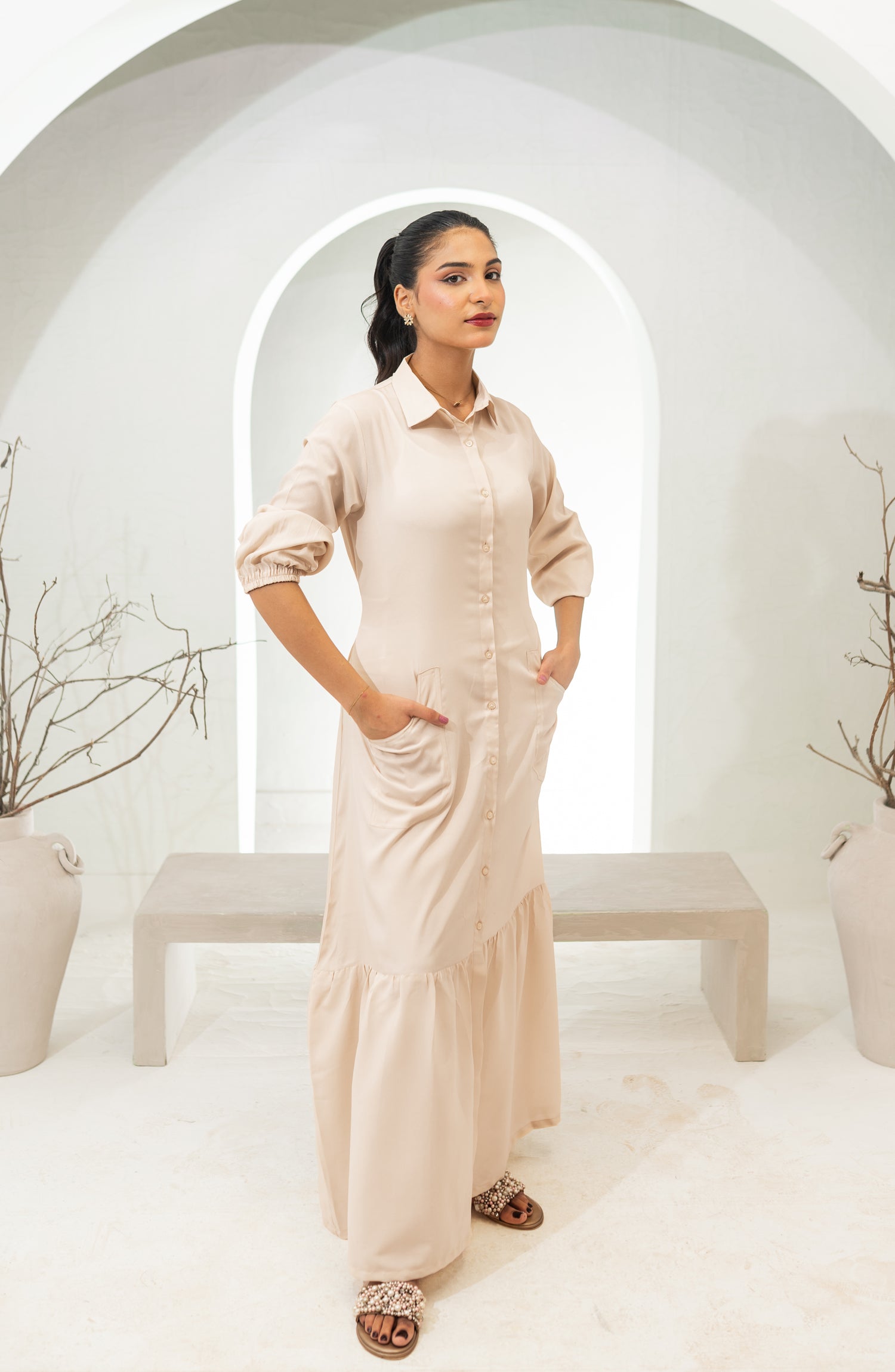 It’s a shirt collar button down long dress with flattering cinched waist and elastic detailing on sleeves.
