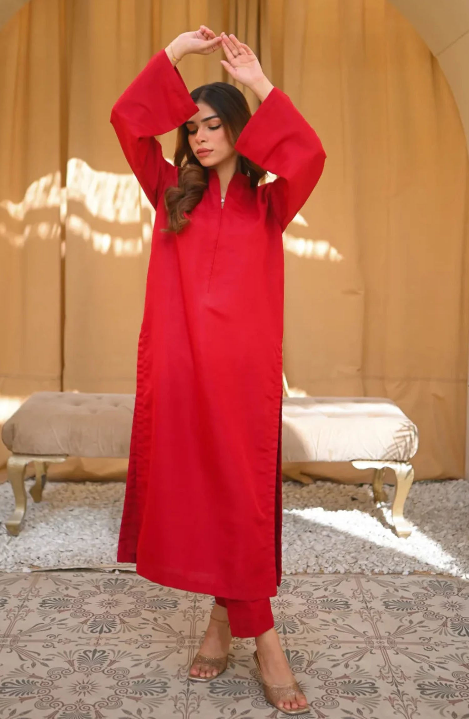 Zauk Casual Raw Silk Stitched 2 Piece Suit - Ruby - ZK25BCS - Red - Casual Collection