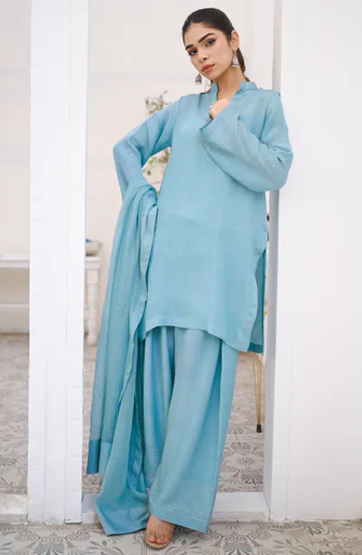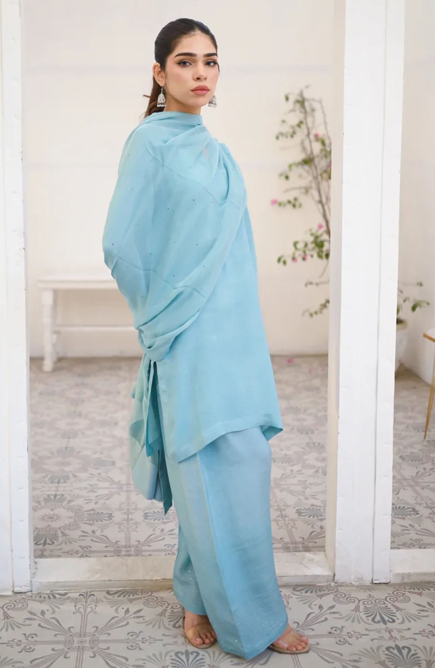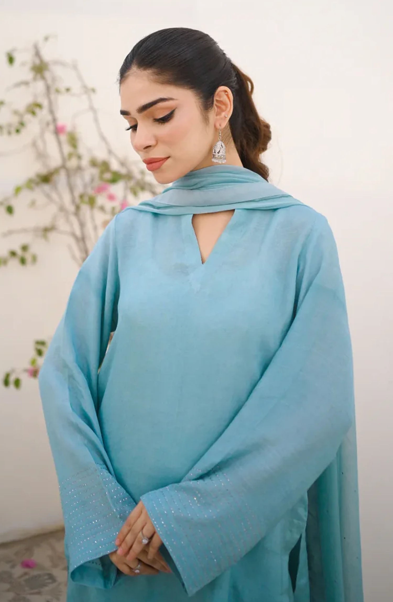 Zauk Casual Rawsilk Stitched 3 Piece Suit - Cyan - ZK25EE - Blue - Festive Collection