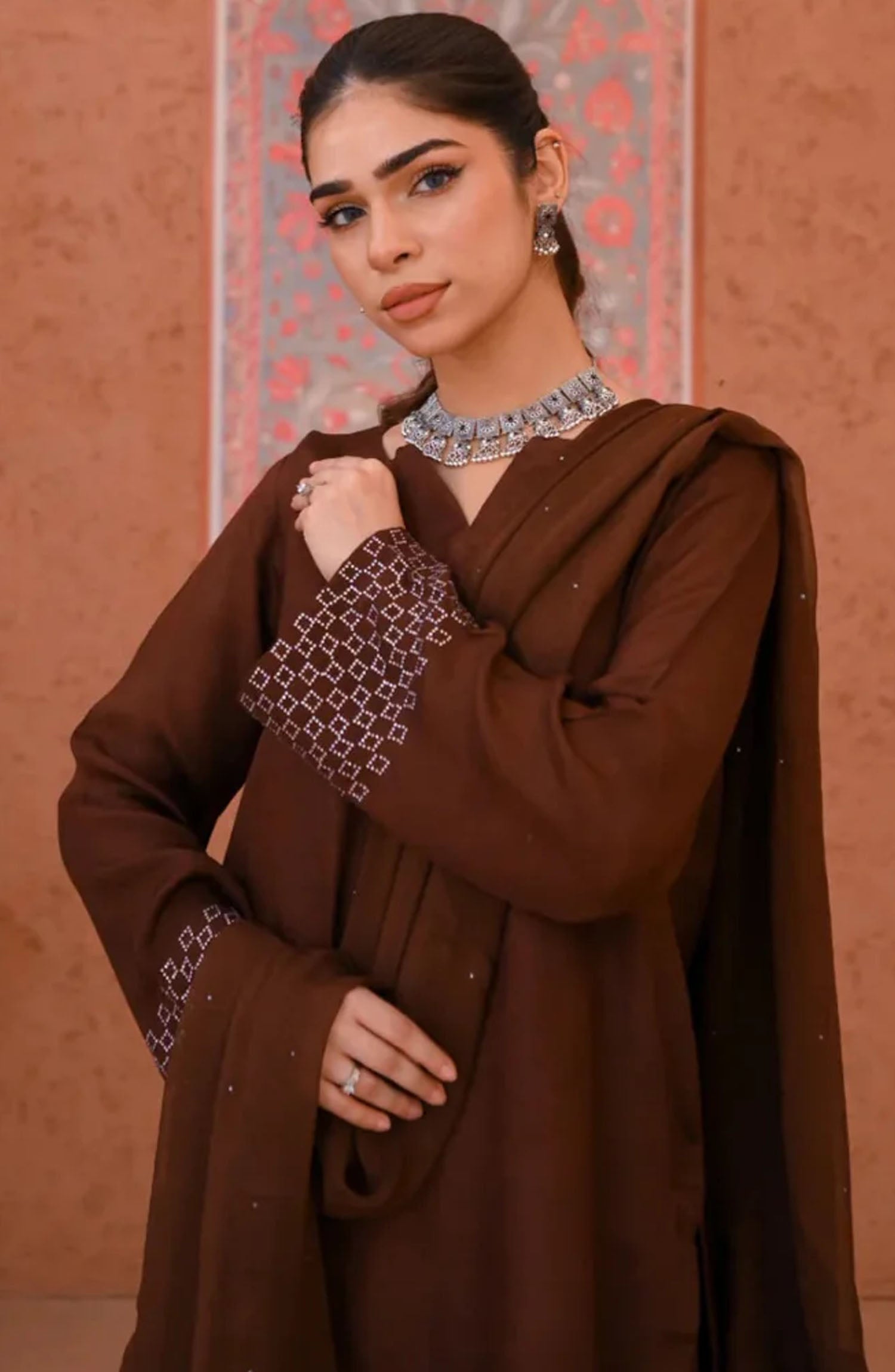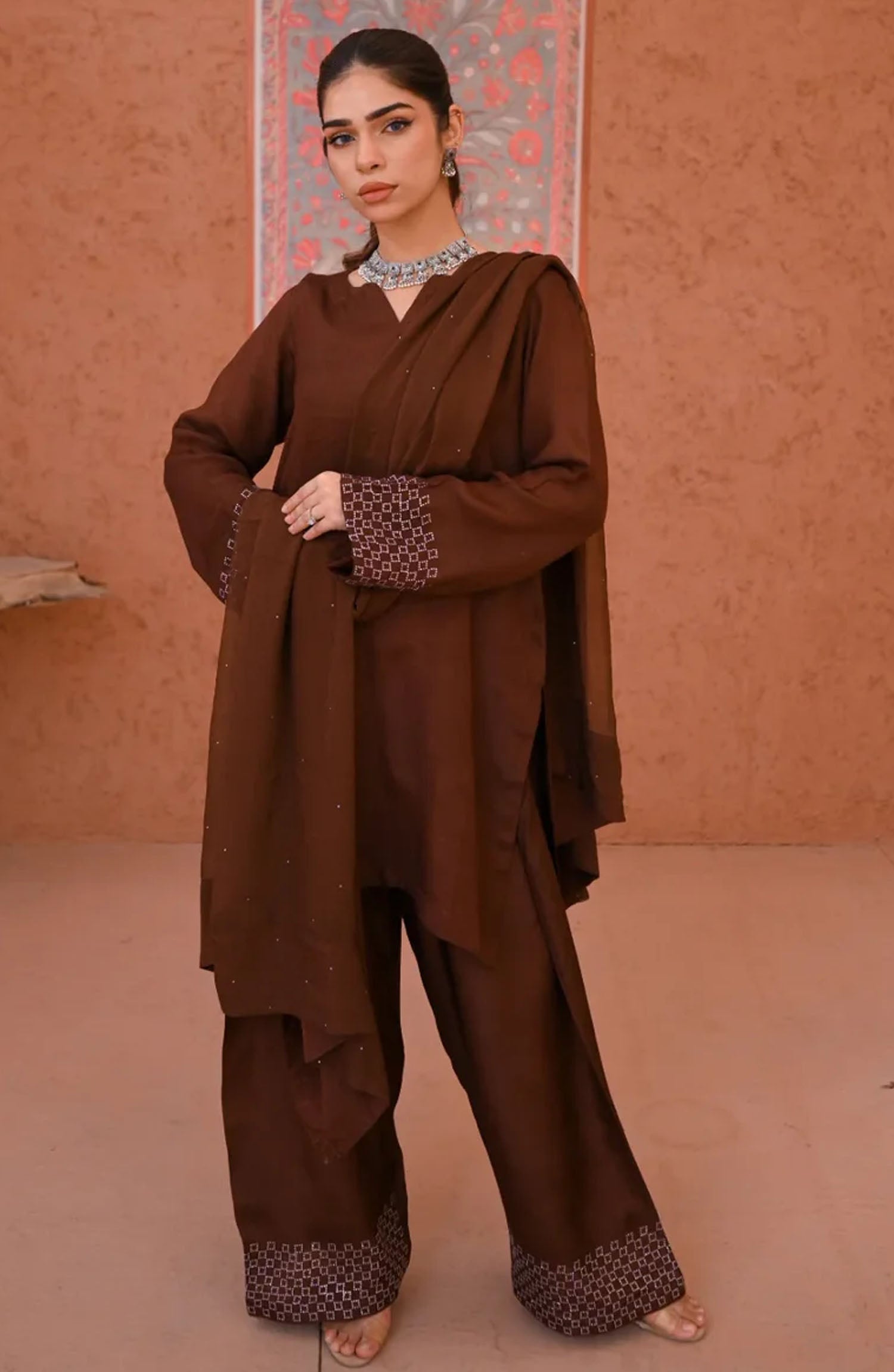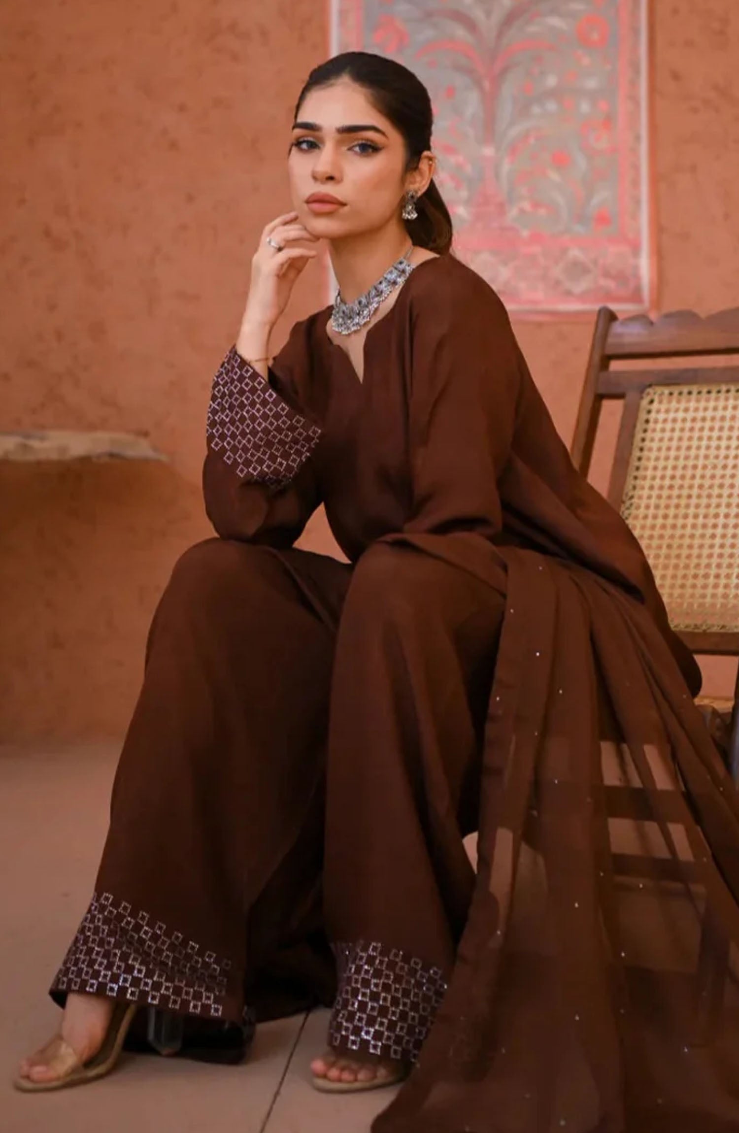 Zauk Casual Rawsilk Stitched 3 Piece Suit - Rosewood - ZK25EE - Brown - Festive Collection