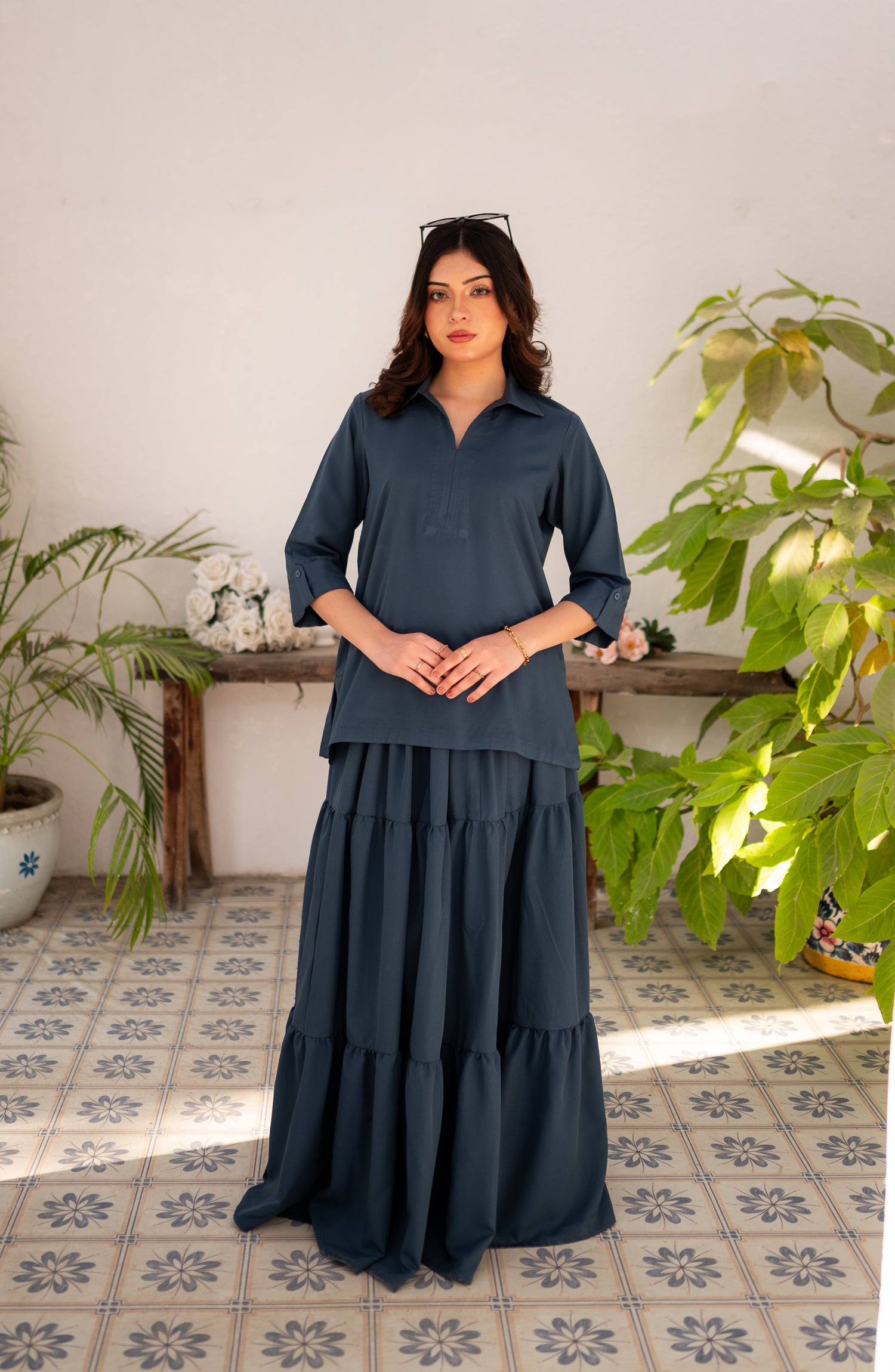 Home Zauk Printed Poly Grip Stitched 2 Piece Suit - Steel Blue Skirt and Shirt - ZK26FSN - Casual Collection