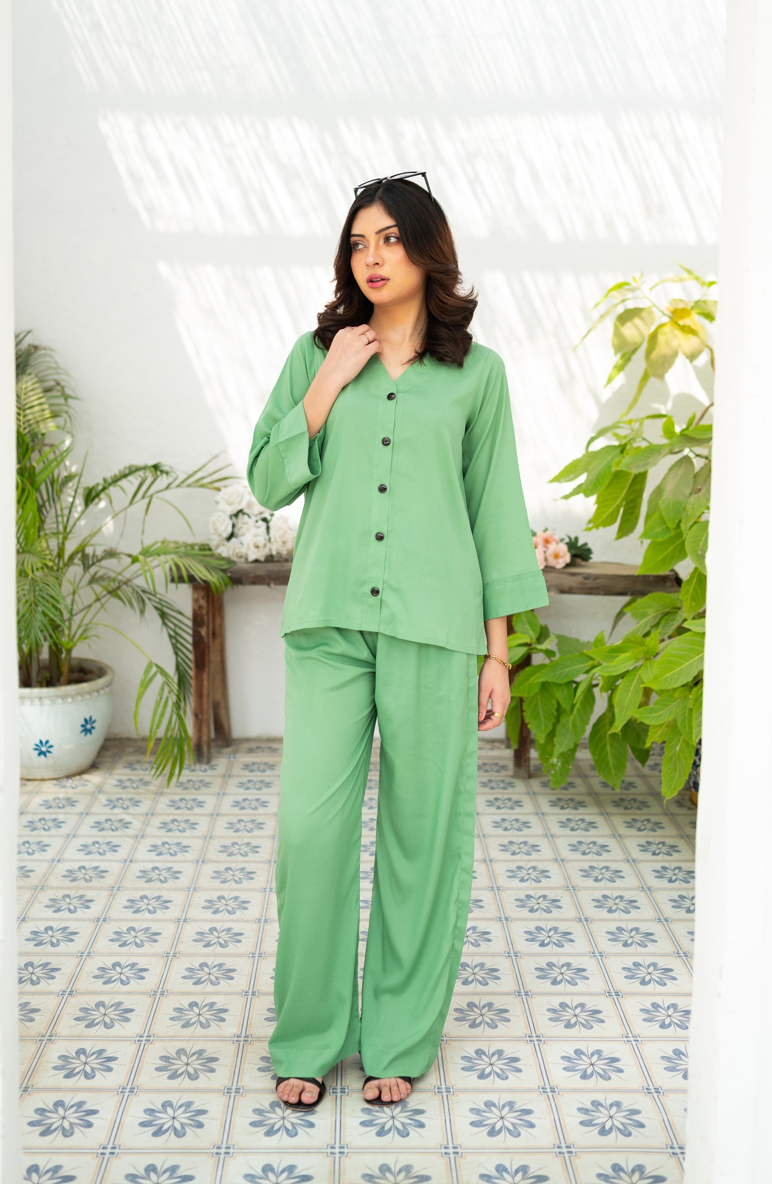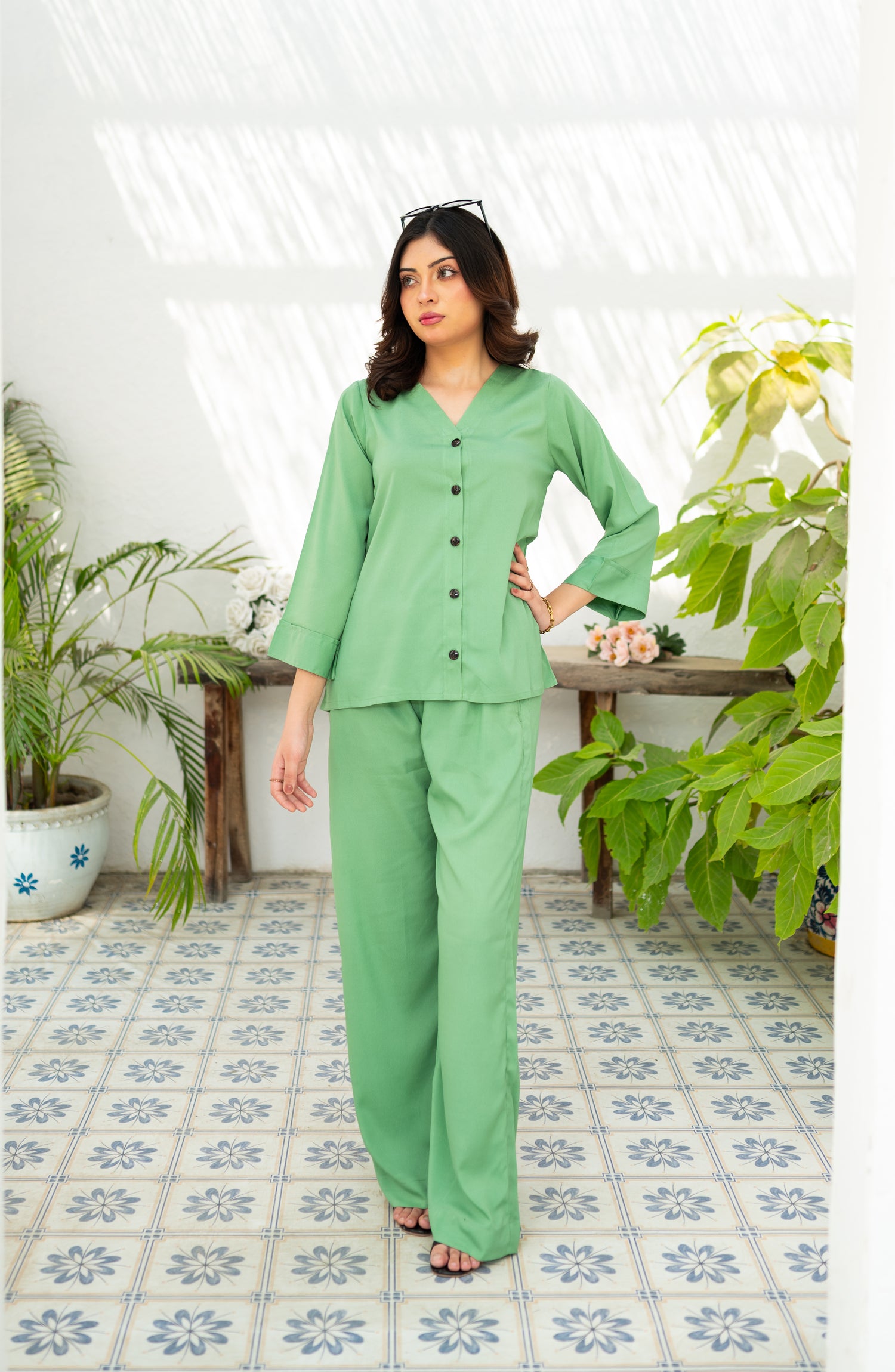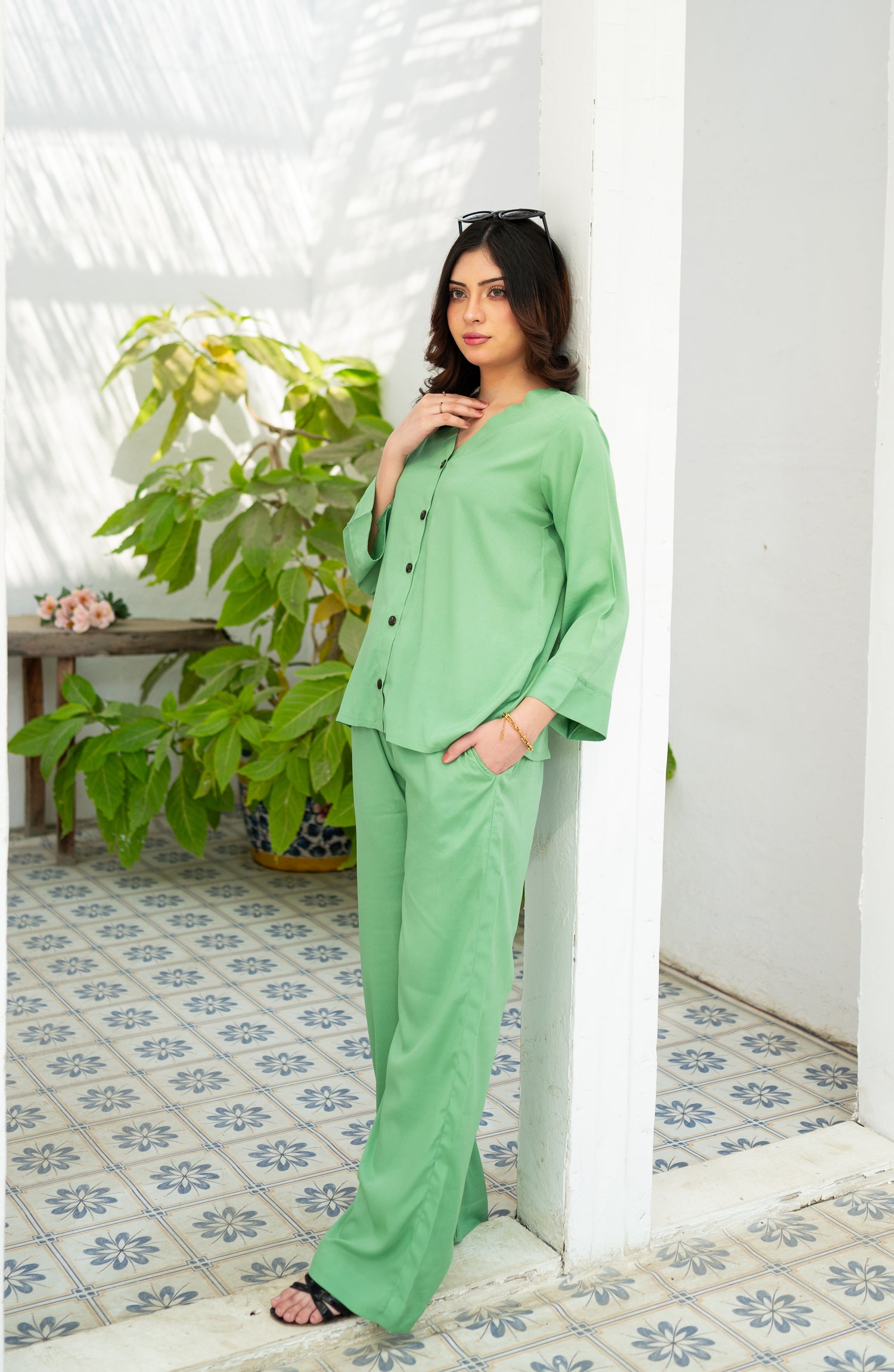 Its a two piece matching set includes a button down shirt along with pocket culottes.