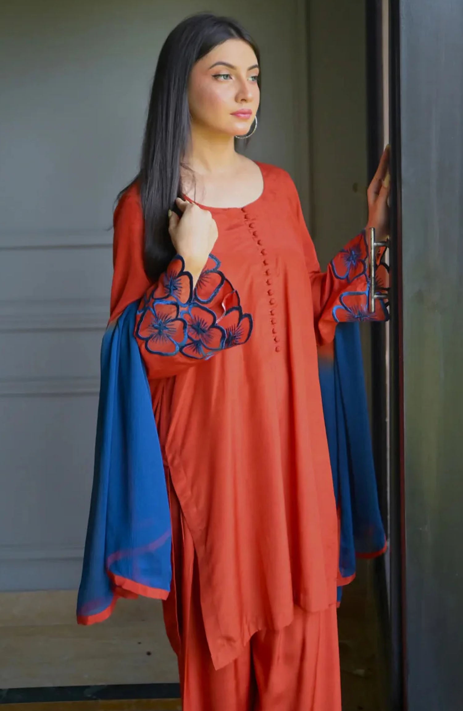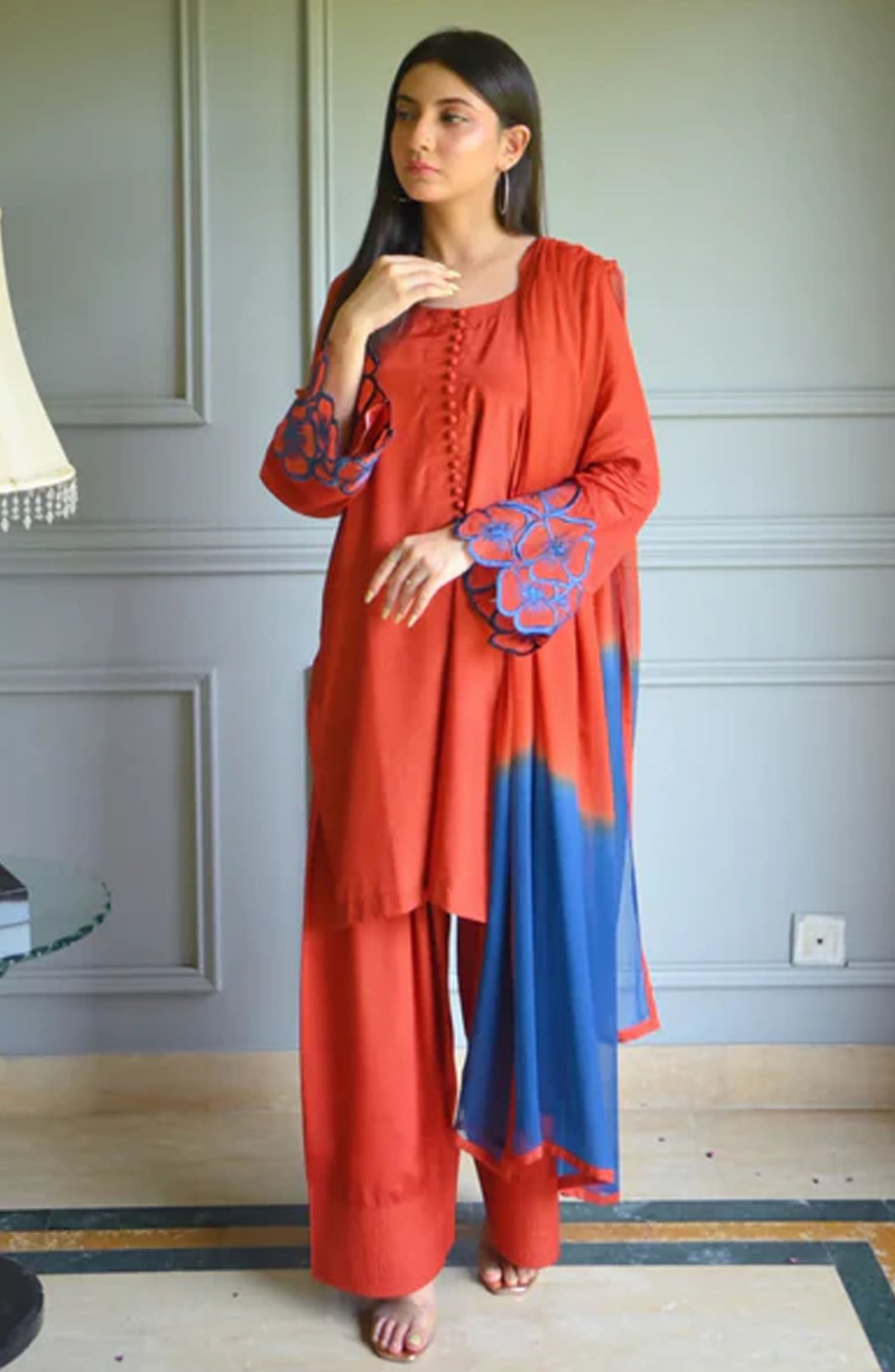 it’s a three piece dress includes embroidered shirt and shalwar along with two tone dyed chiffon dupatta. actual product color may slighly vary from the image
