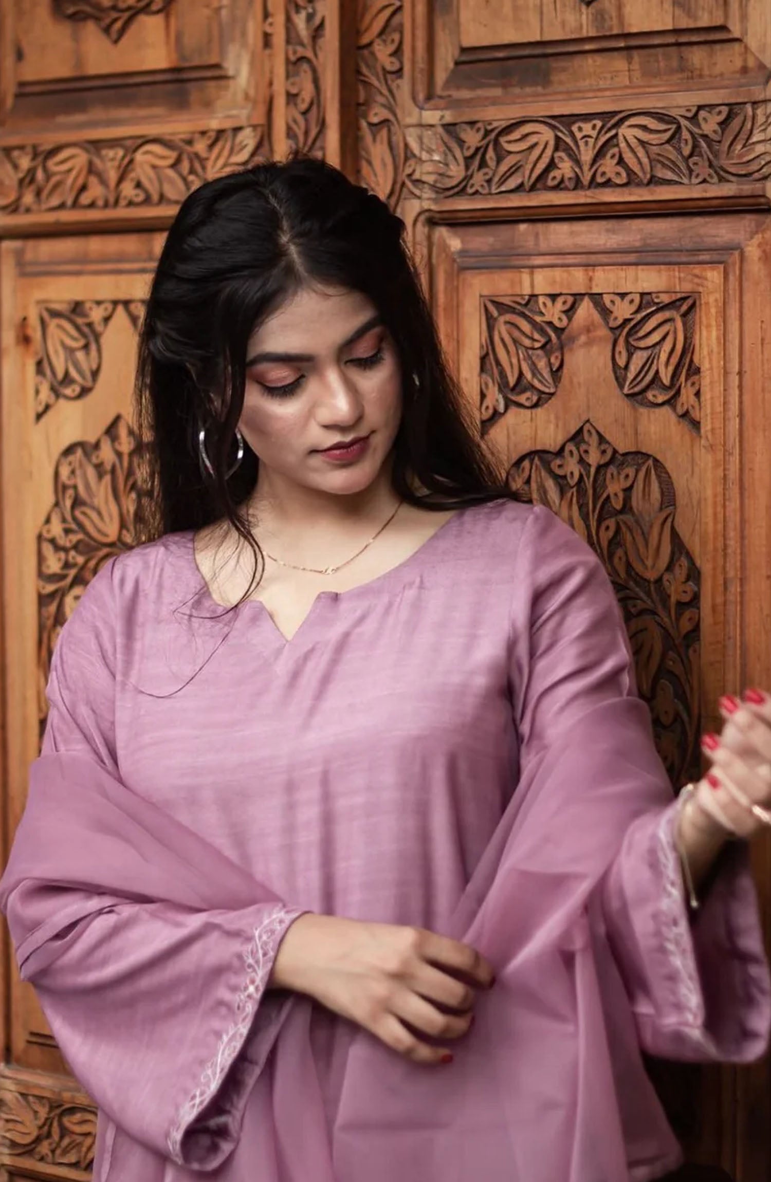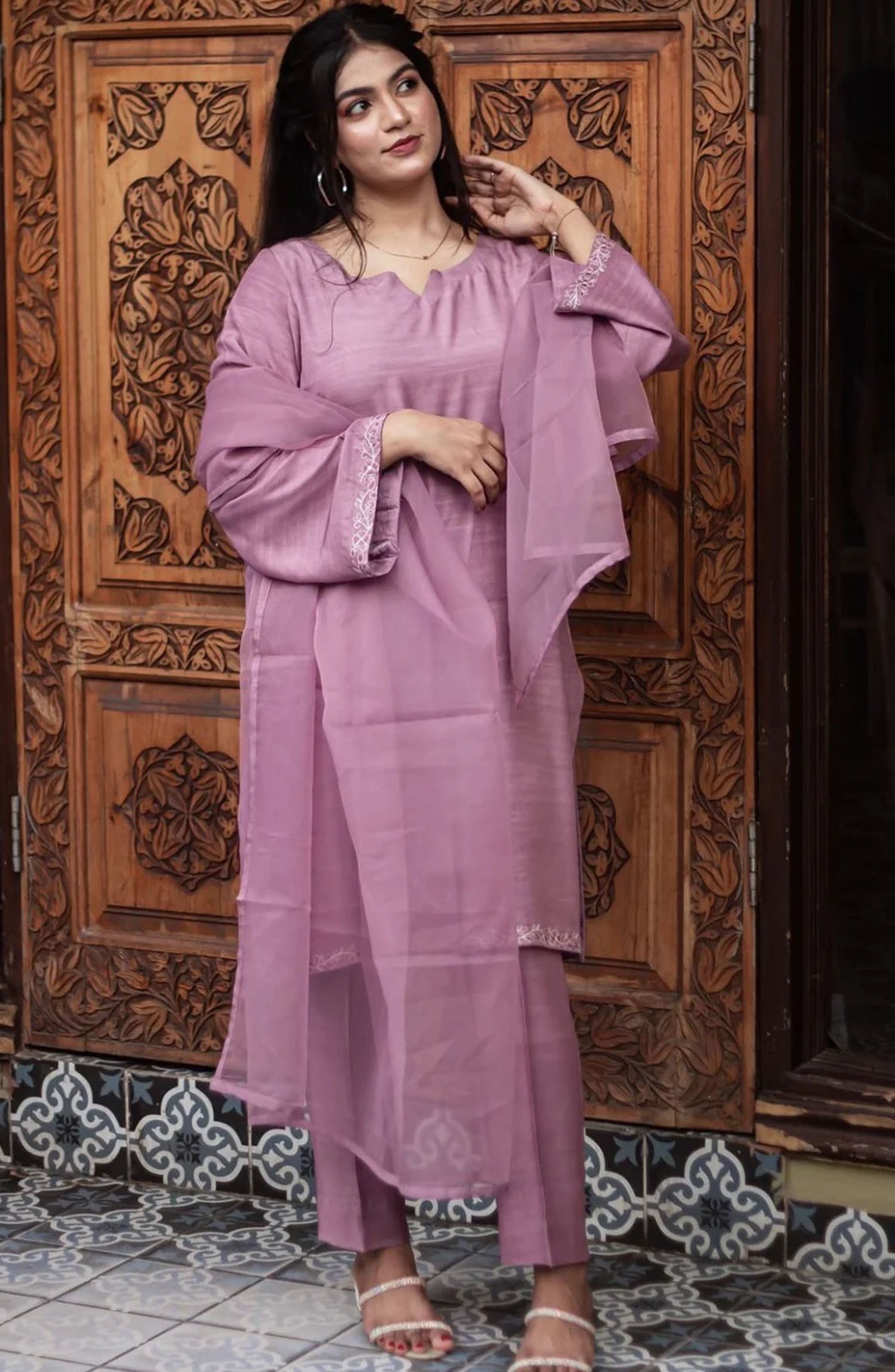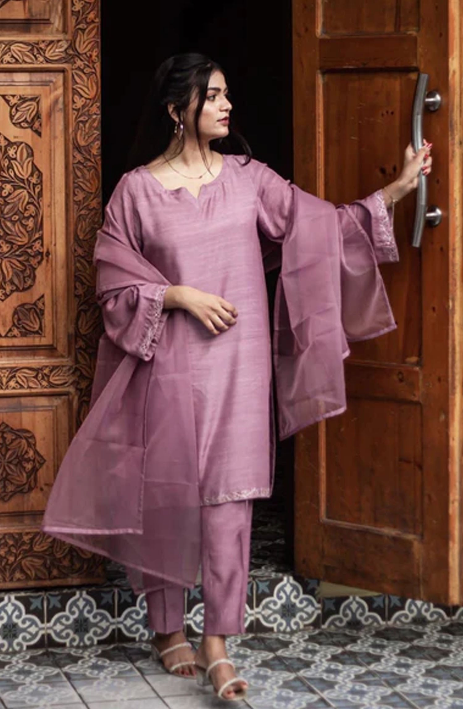itâs a lavender pure rawsilk three piece dress with embroidery detailing on daman and sleeves along with organza dupatta actual product color might slightly vary from the image