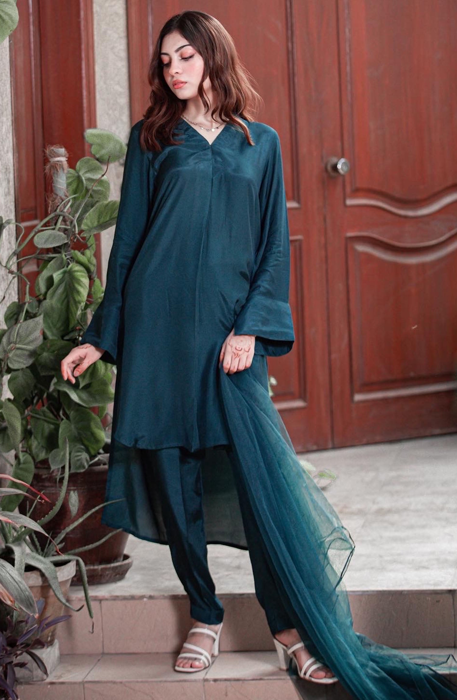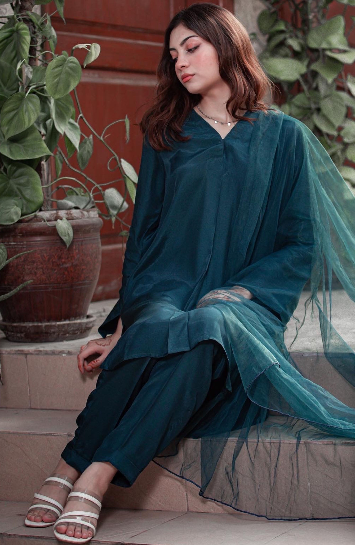 itâs a cotton silk teal blue matching set includes a shirt and pant with matching net dupatta.