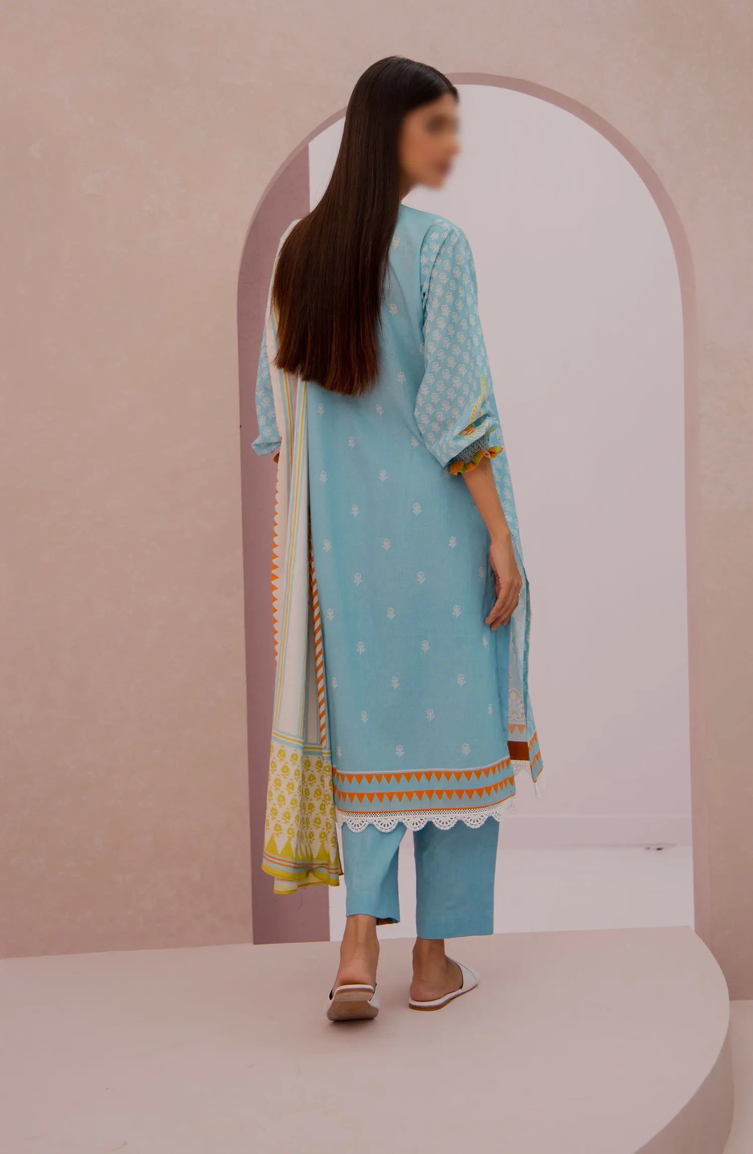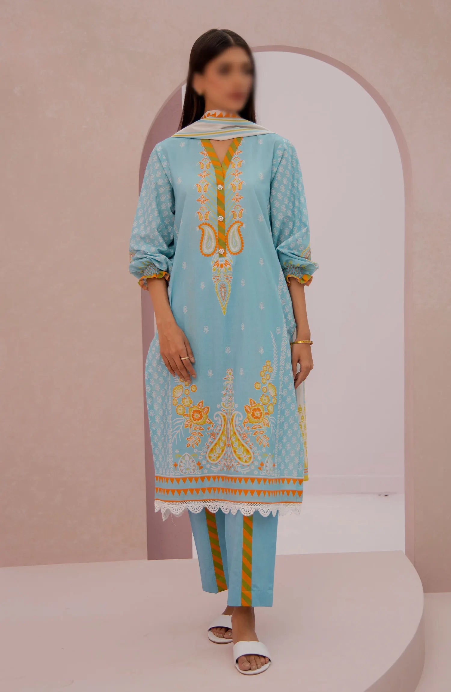 The standard style comes as a long-sleeved kameez with dupatta and trouser/shalwar.