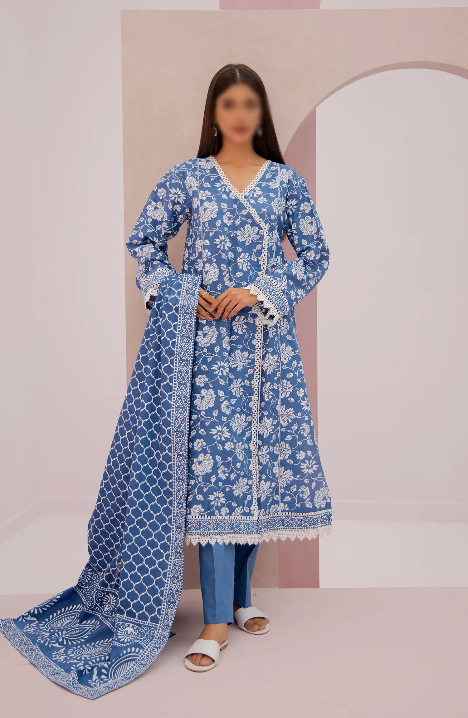 Modest Embroidered Chiffon Stitched 3 Piece Suit - 9840-Cblu - MOD25PRF - Blue - Festive Girls Collection