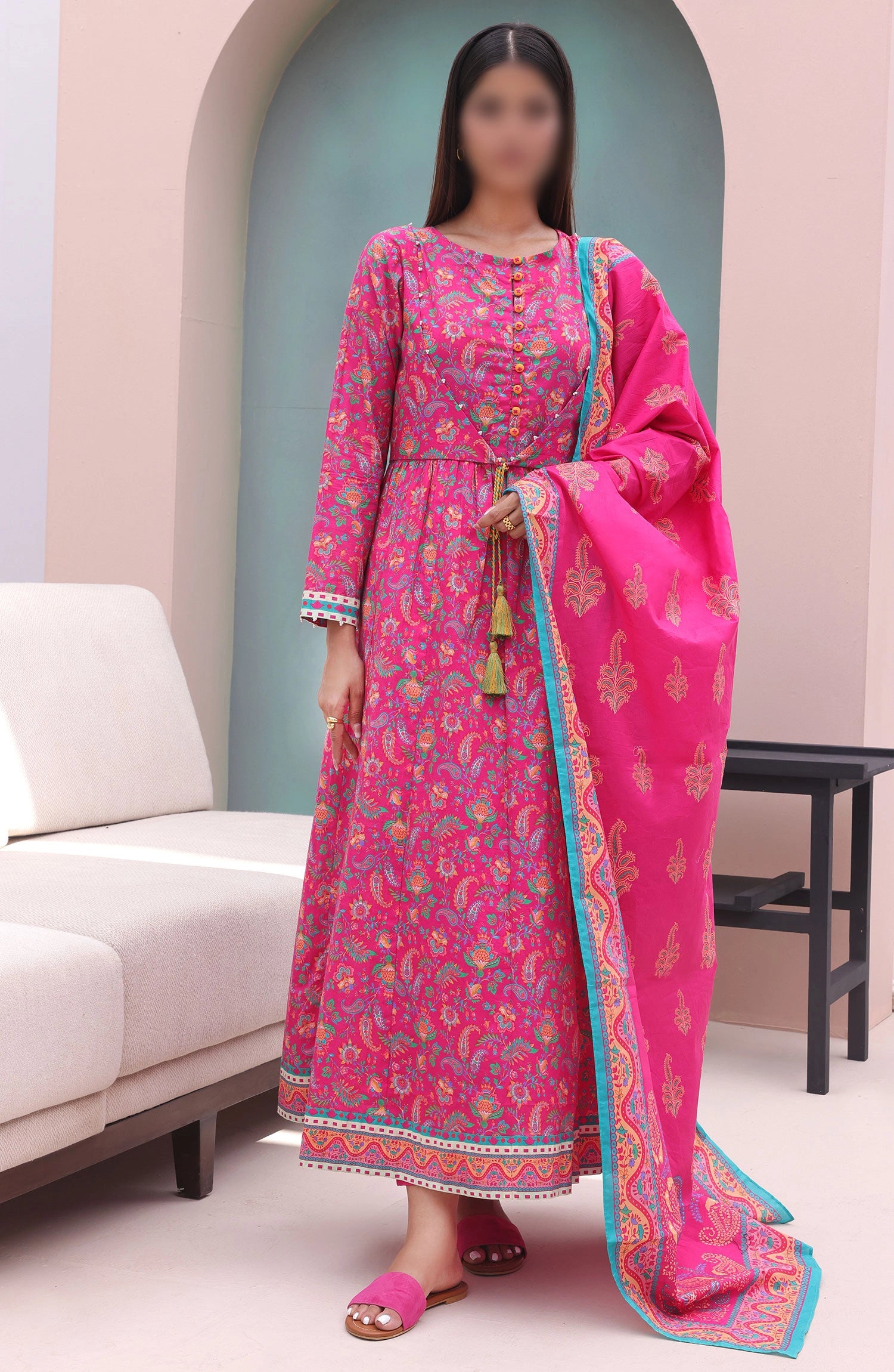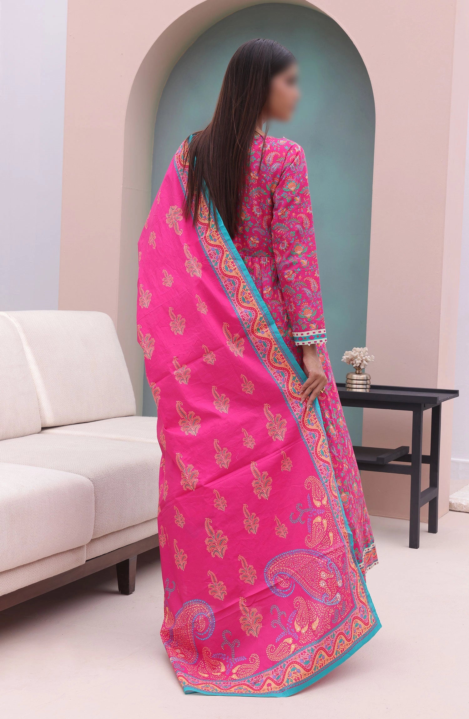 The standard style comes as a long-sleeved kameez with dupatta and trouser/shalwar.