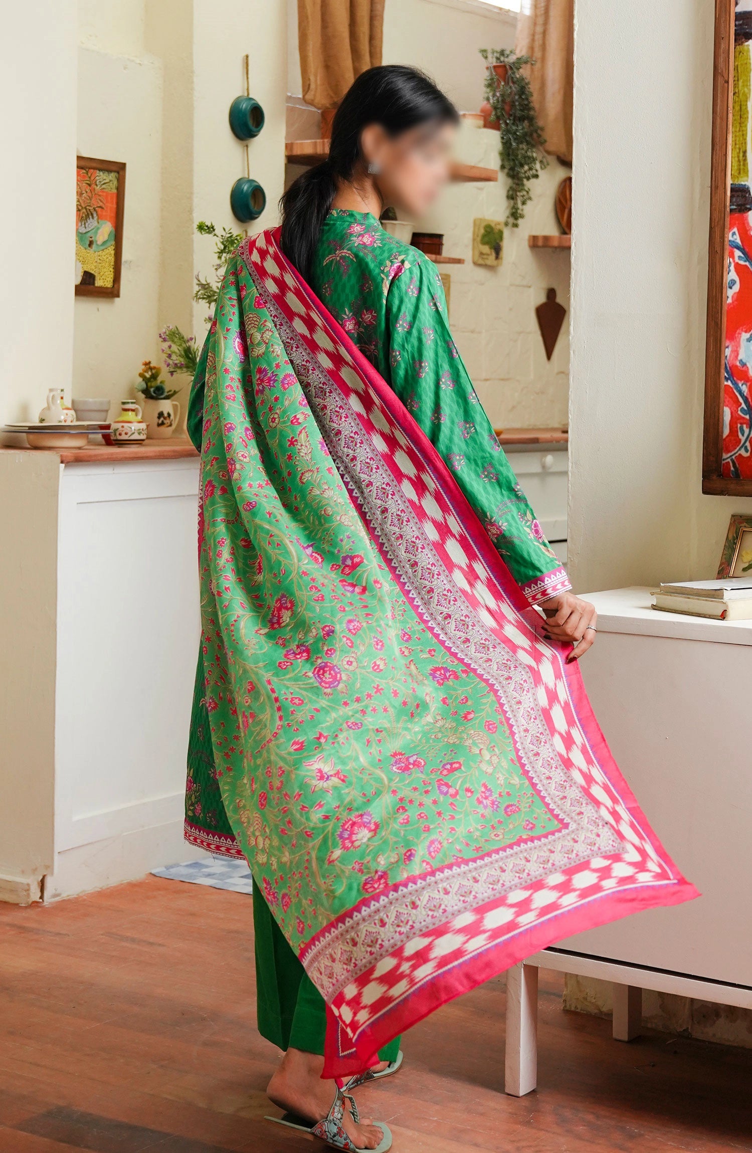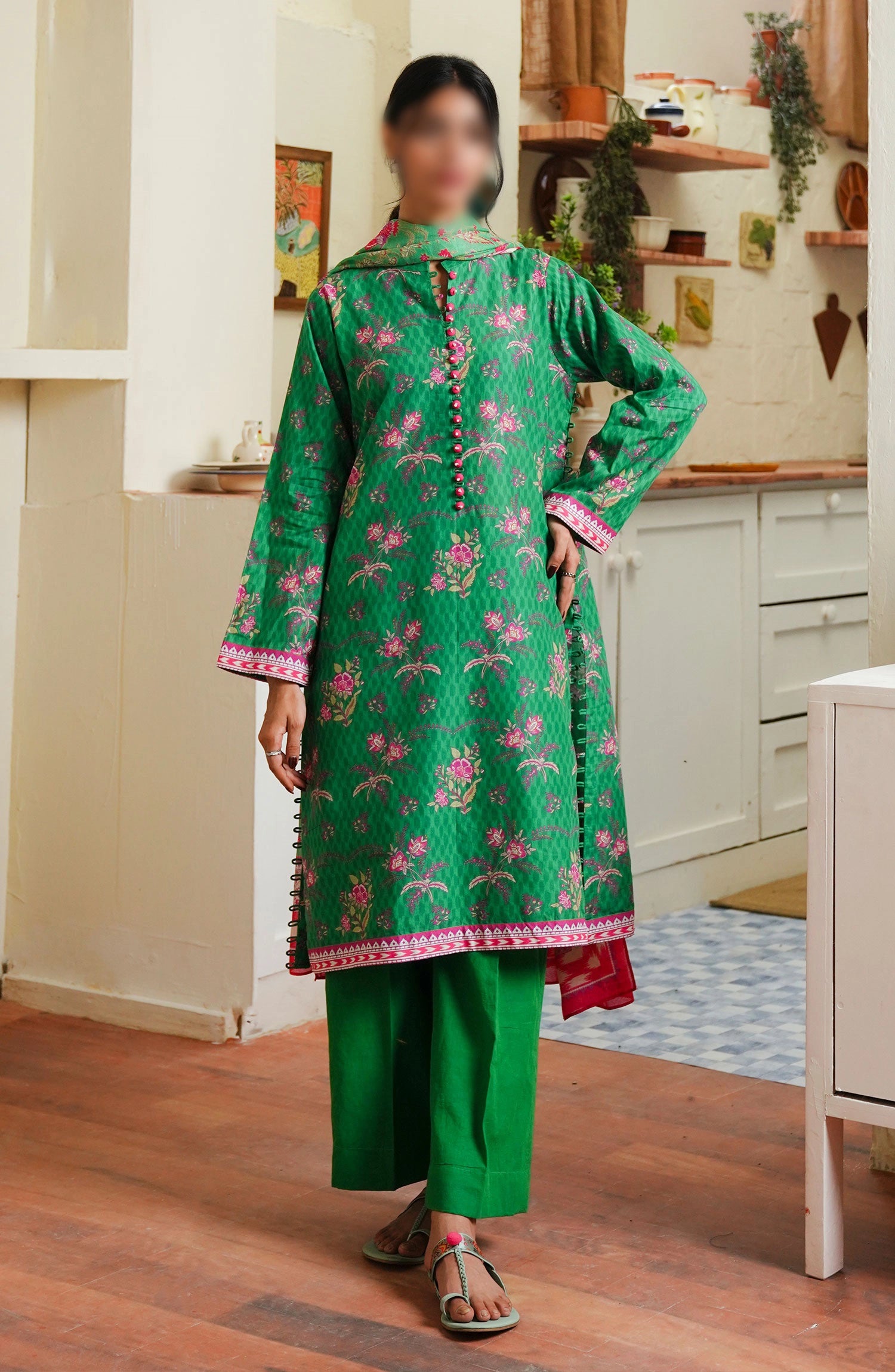 The standard style comes as a long-sleeved kameez with dupatta and trouser/shalwar.