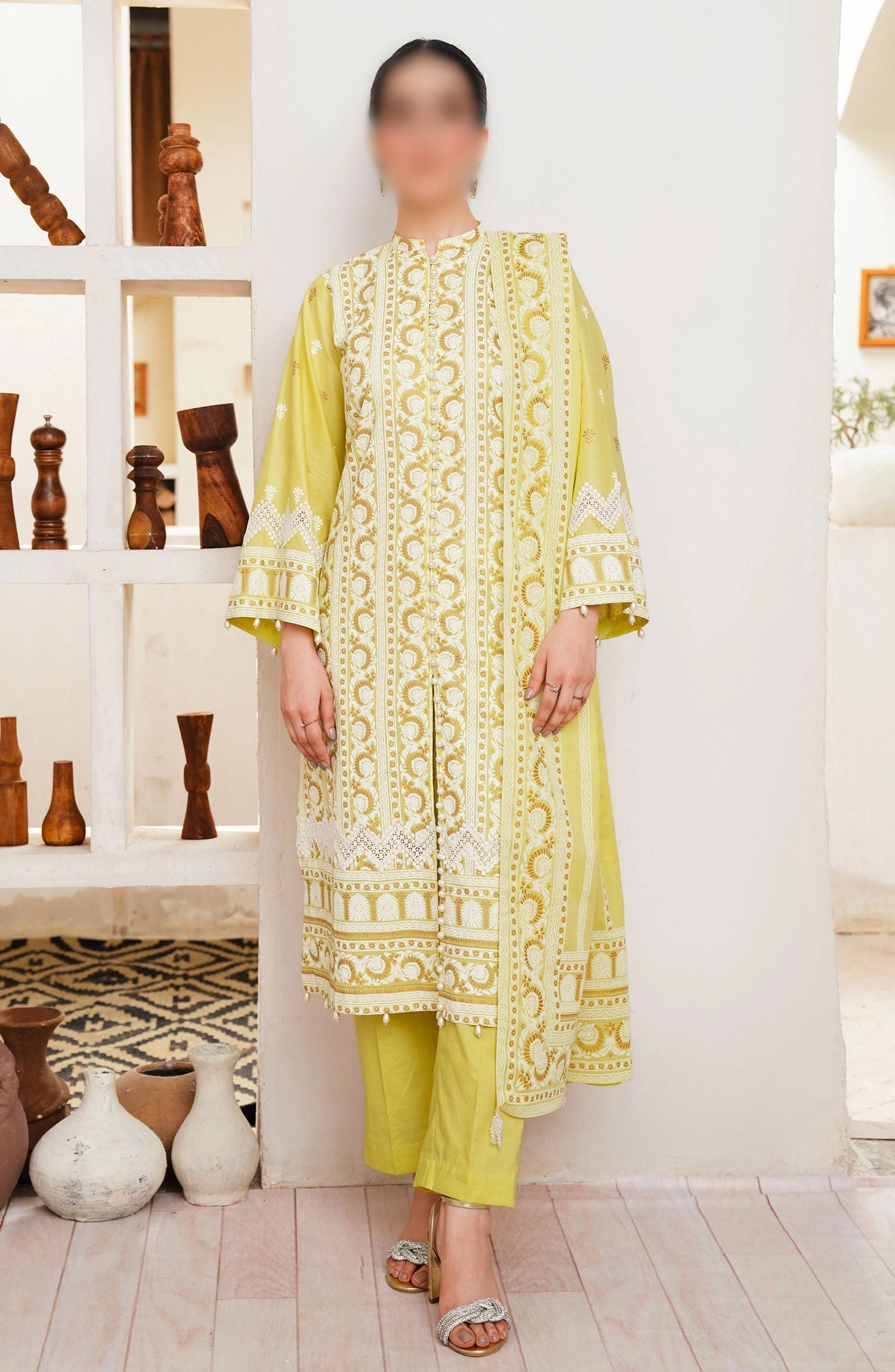The standard style comes as a long-sleeved kameez with dupatta and trouser/shalwar.