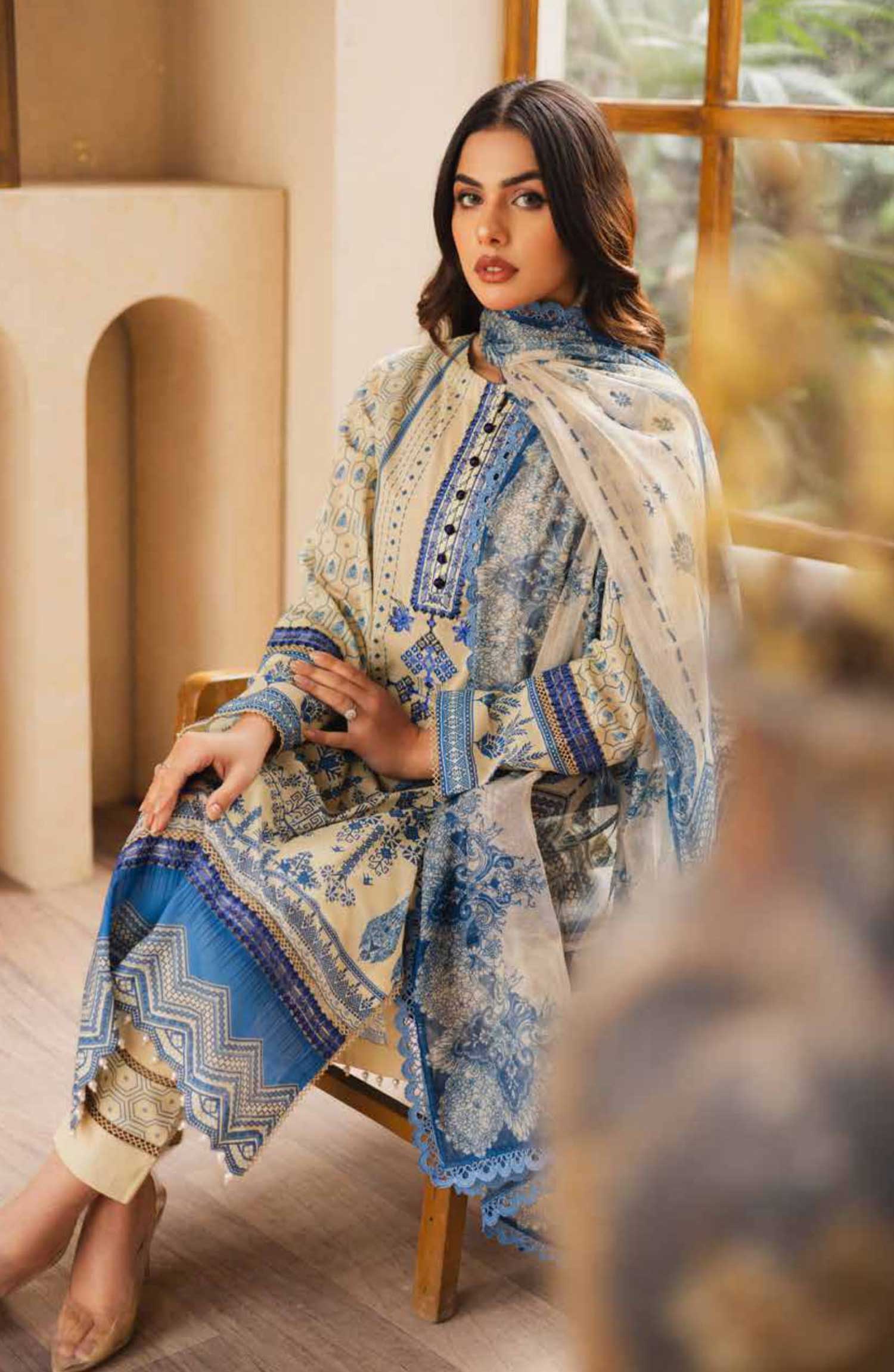 Freesia Zen Embroidered Lawn Collection 2025 has been styled in the image for photography and illustrative purposes.