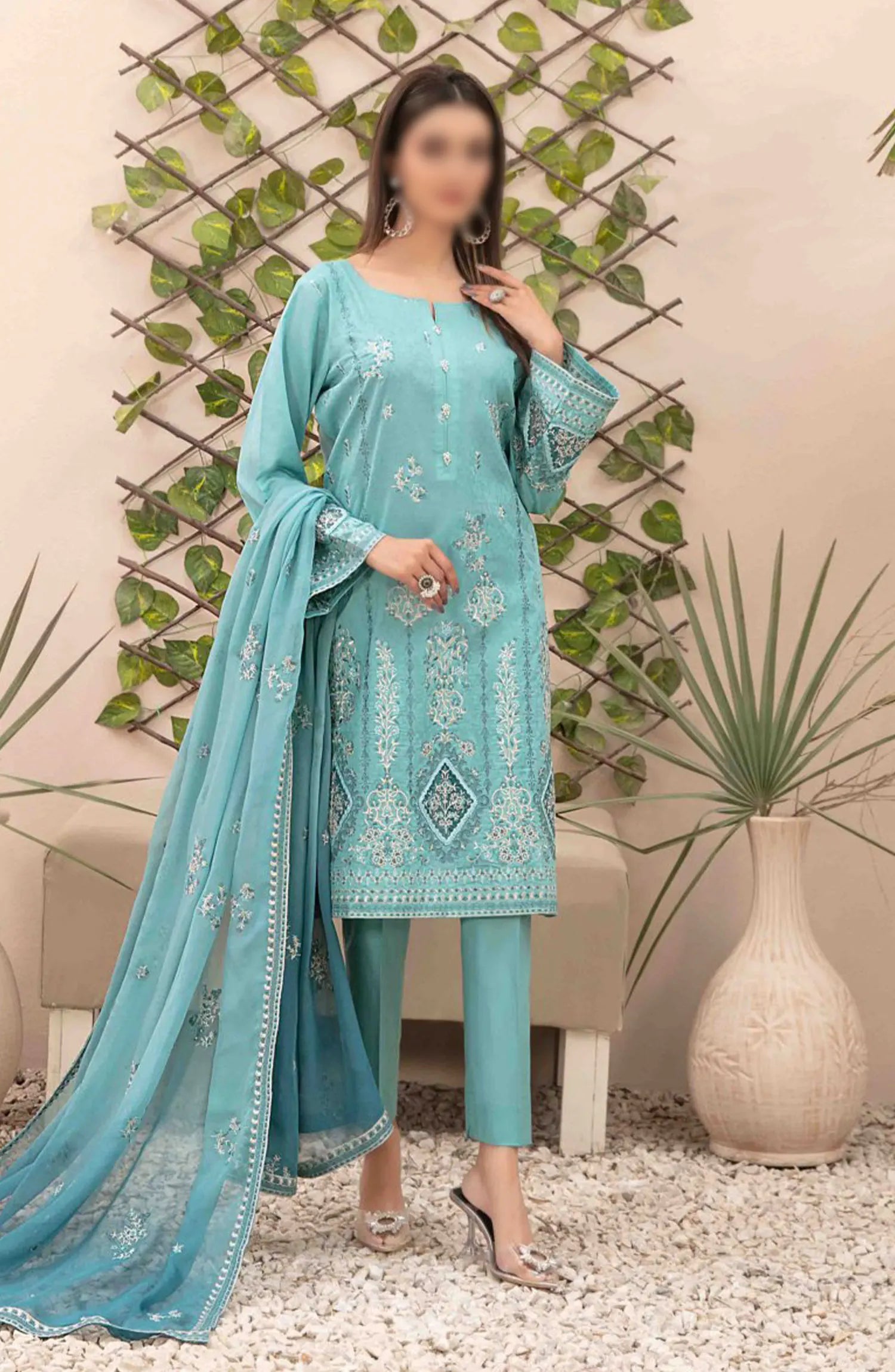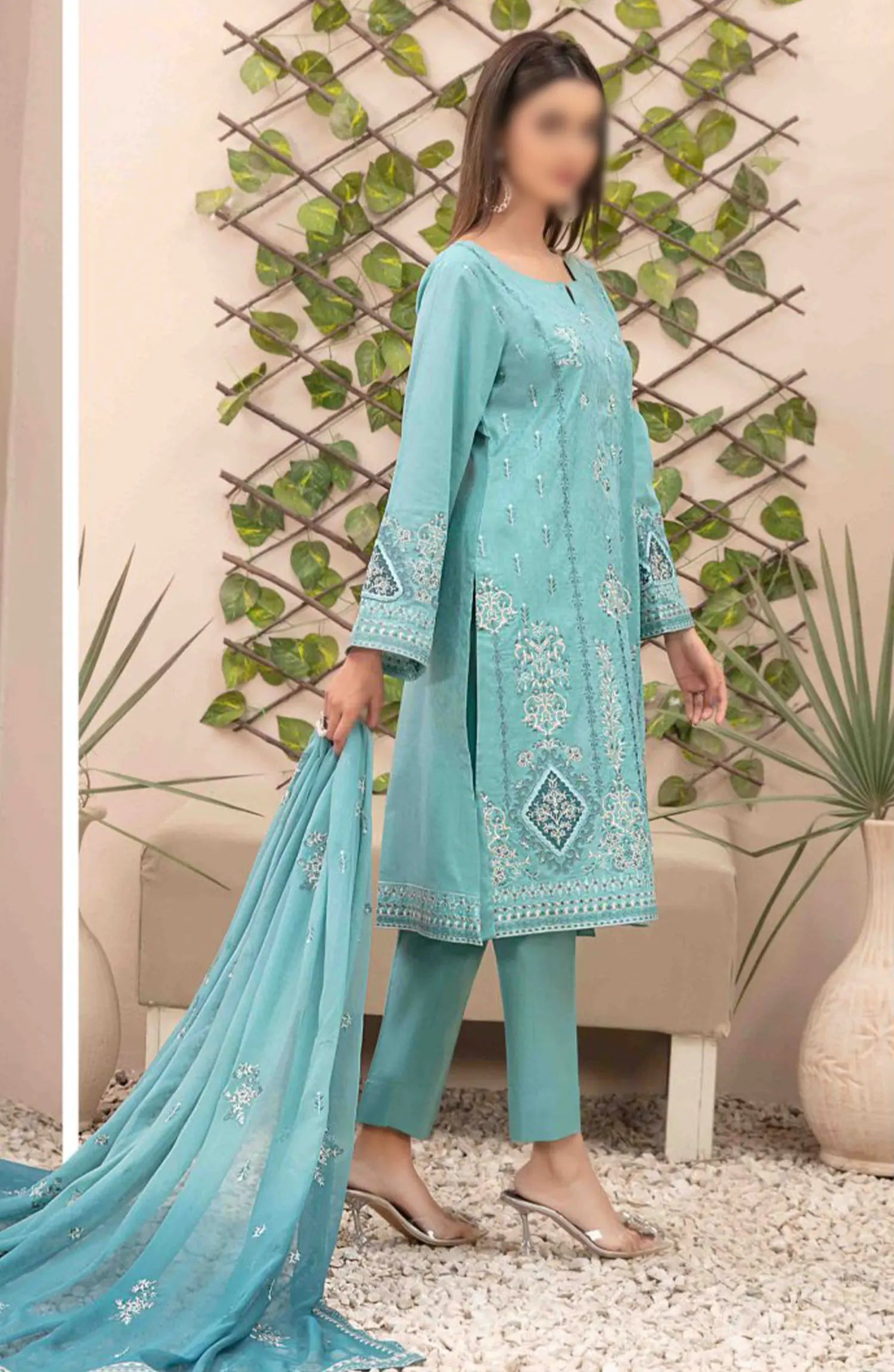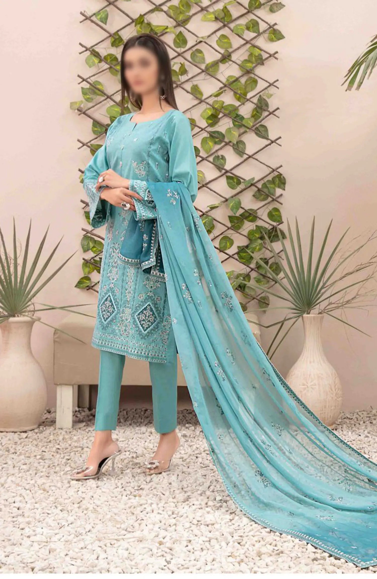 Zenel - Fancy Embroidered Jacquard Lawn Collection 2024 has been styled in the image for photography and illustrative purposes.