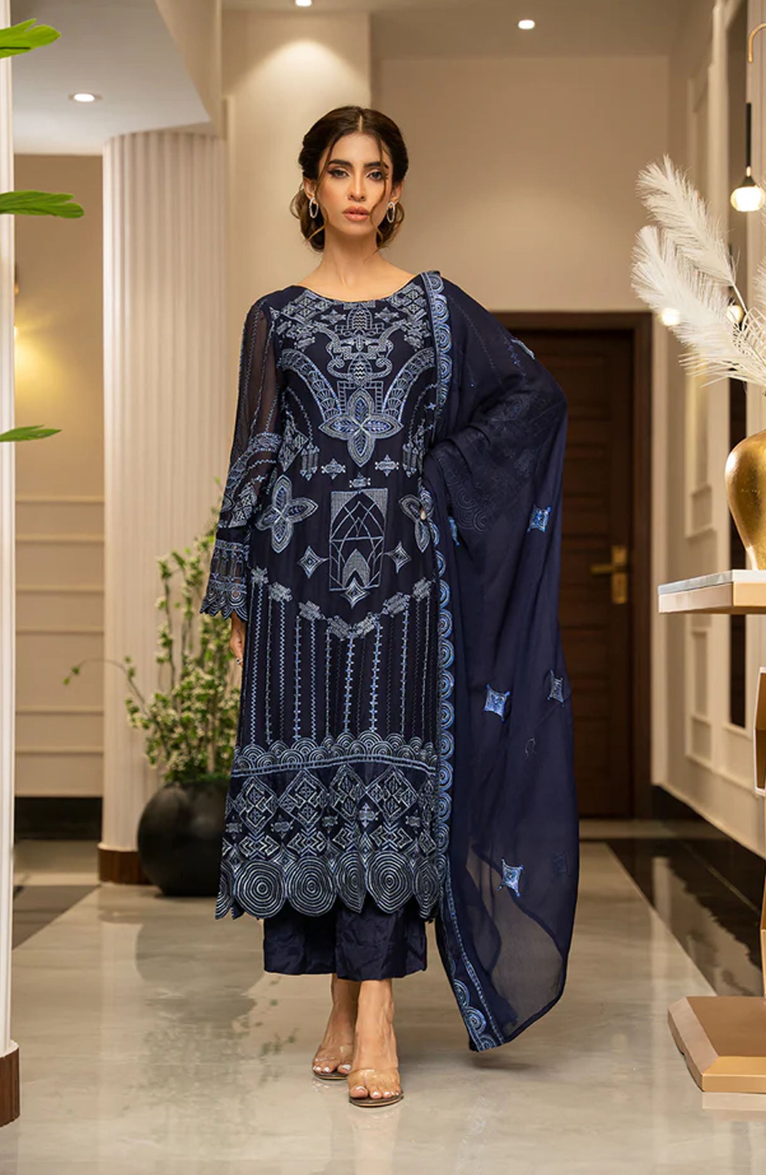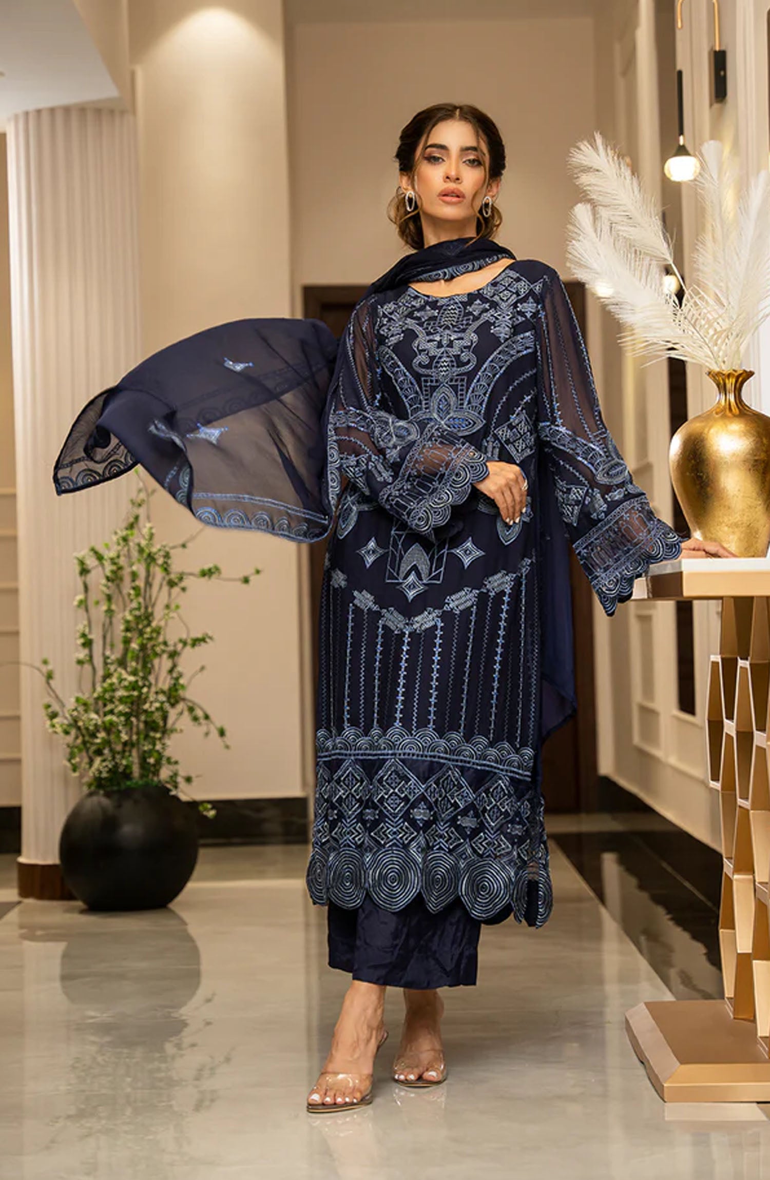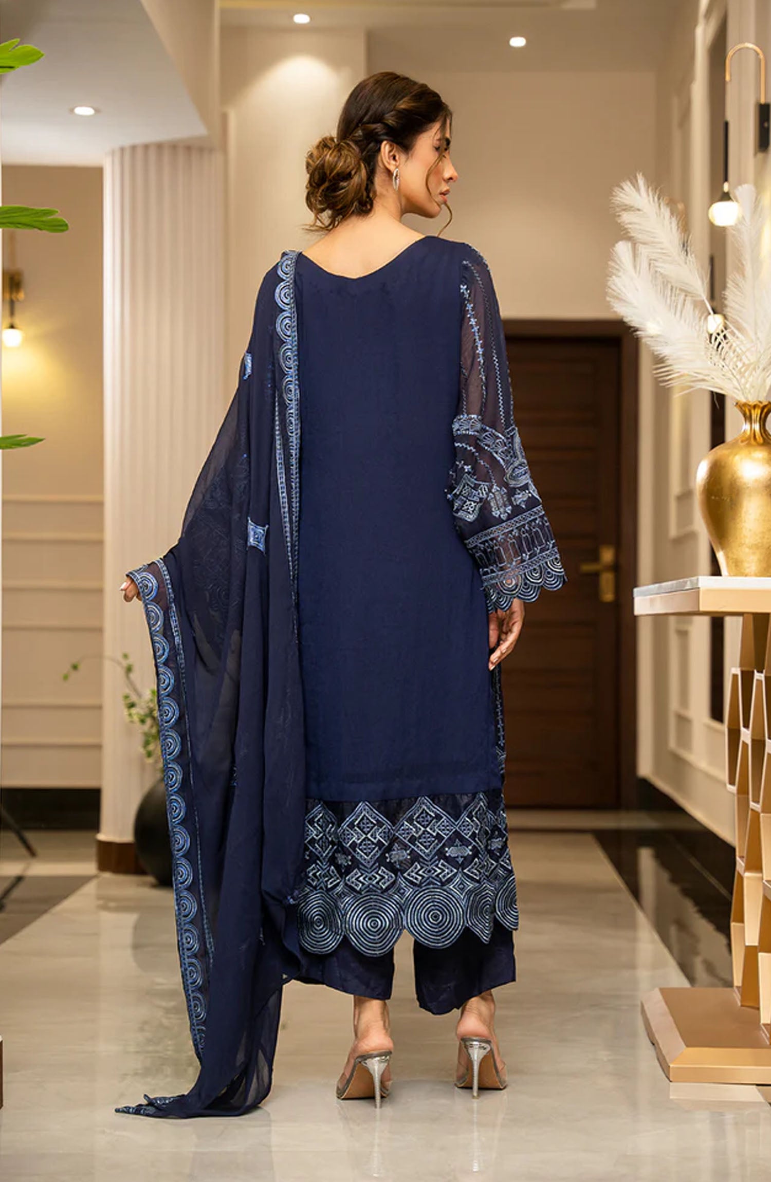 Zouj Embroidered Chiffon Unstitched 4 Piece Suit - Royal Drape - ZJ25EUCE - Blue - Festive Collection